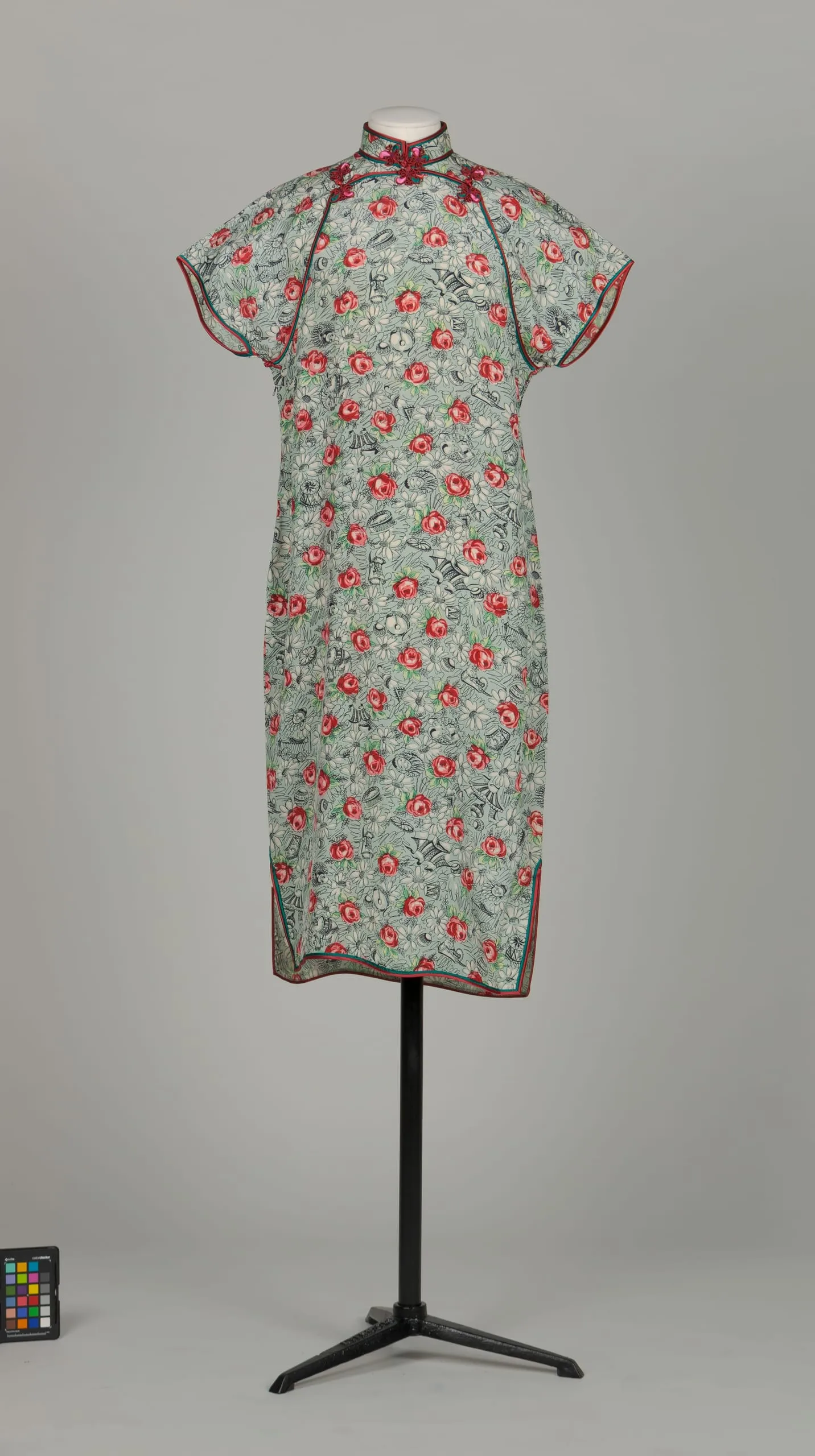- Rayon plain weave, printed, with silk satin trim and frog (huaniu) closures