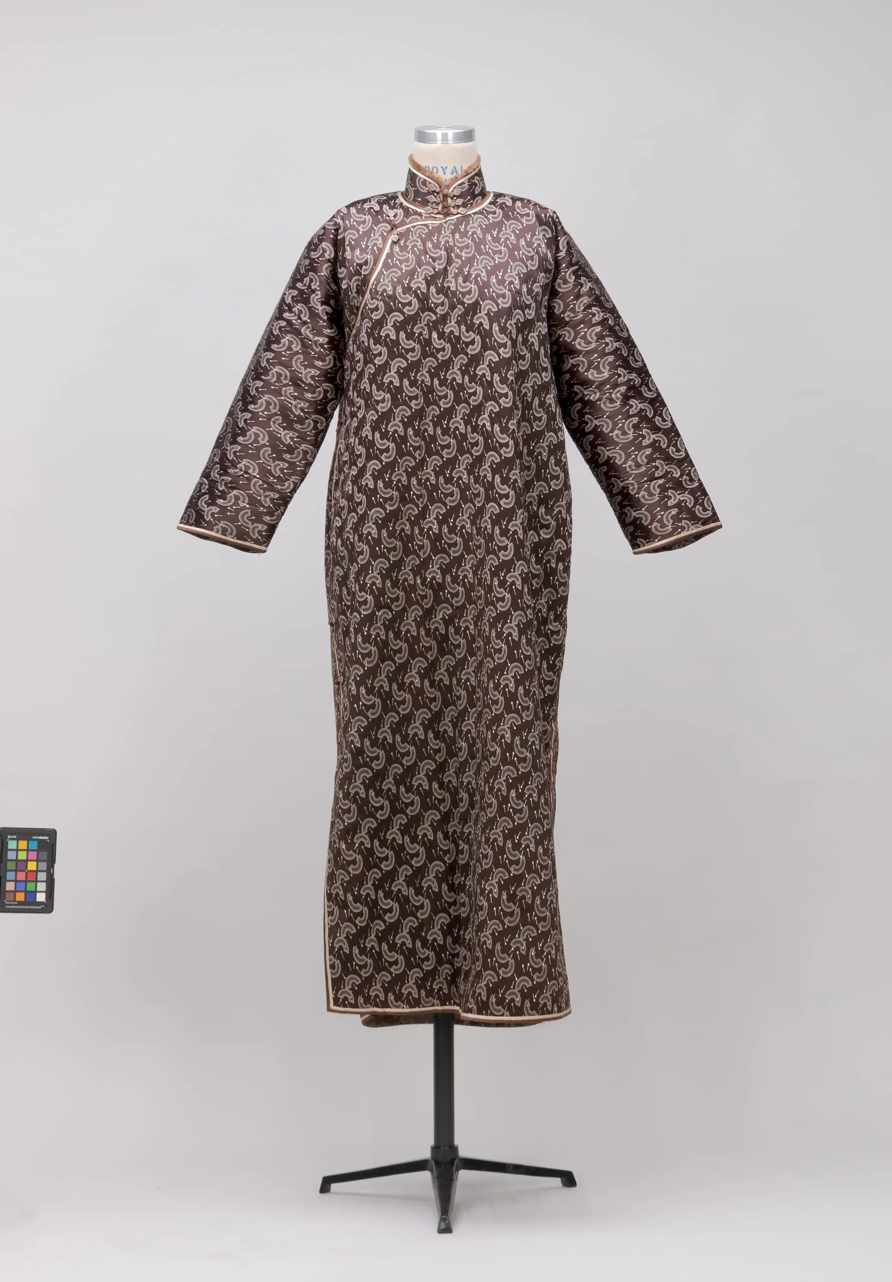 - Silk satin with warp and weft patterning, with silk satin trim and frog (huaniu) closures and squirrel fur lining