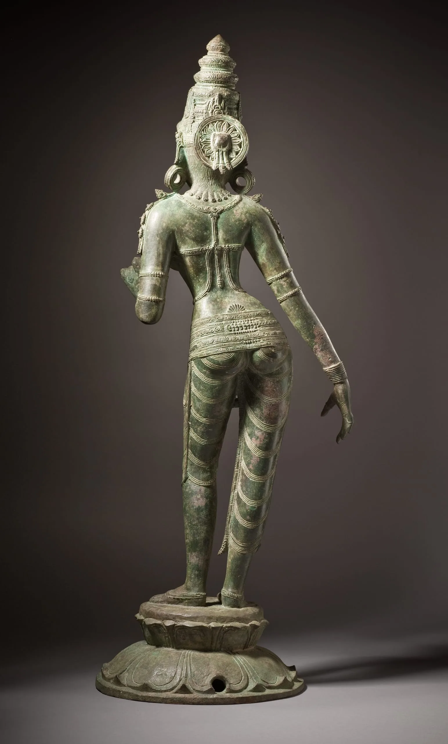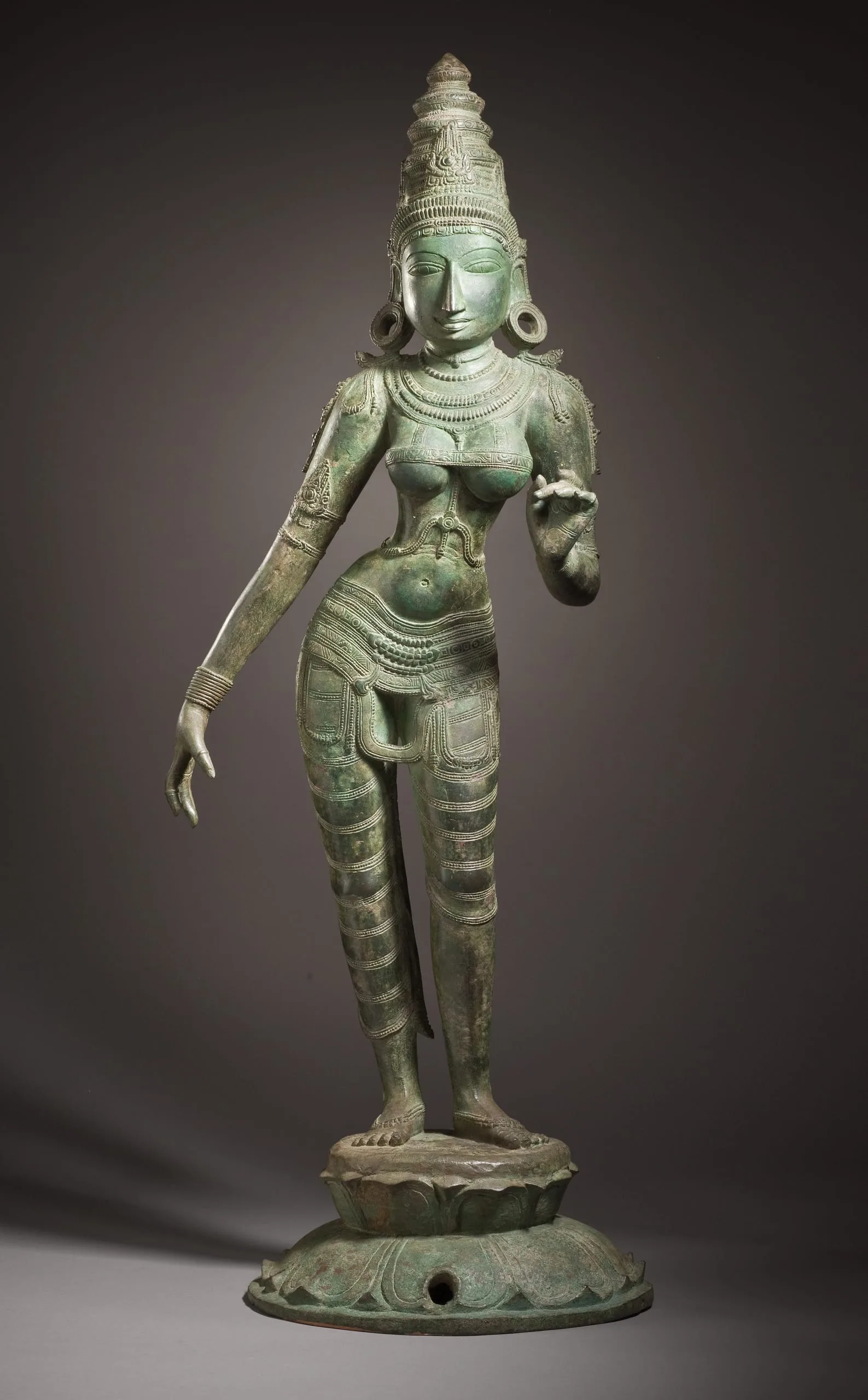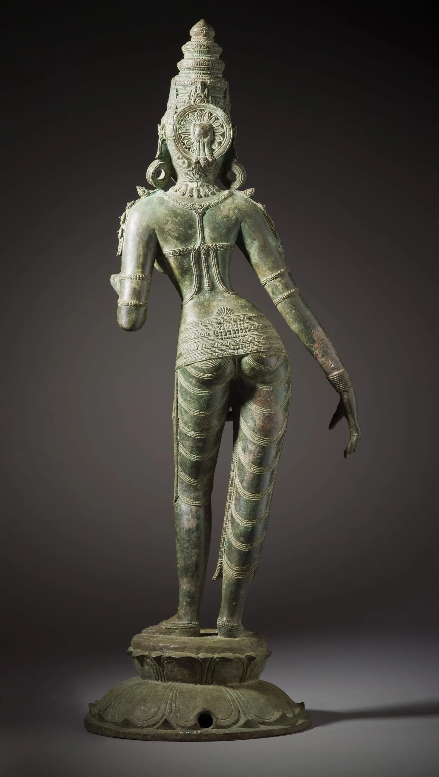 These separate copper alloy (bronze) representations of the Hindu god Vishnu flanked by his wives Shridevi (or Lakshmi) and the earth goddess Bhudevi form a Vaishnava matrimonial triad (M.70.5.1-.3). Originally made as processional images, each deity stands on a double lotus base cut with holes for attaching them to the support poles.