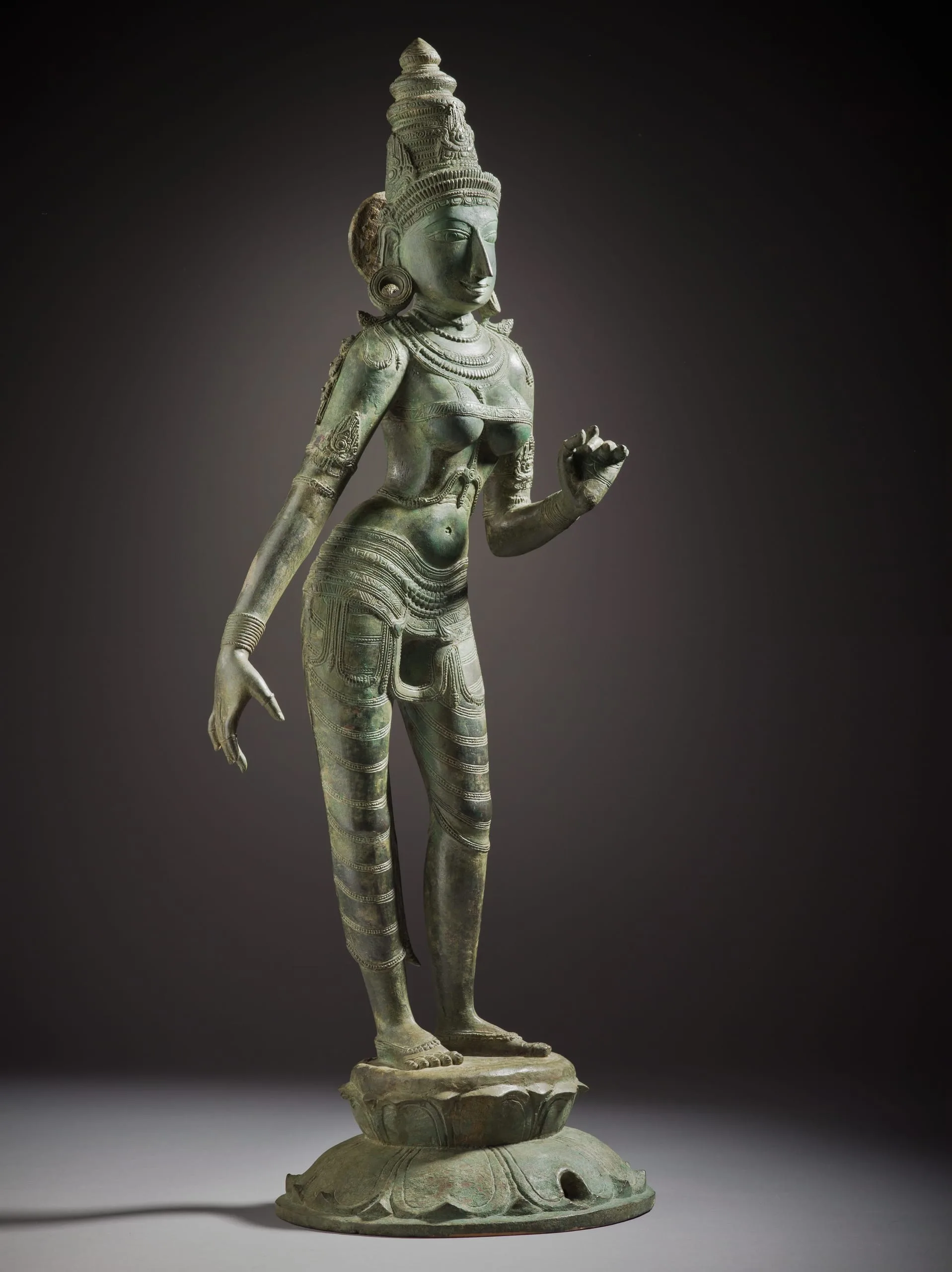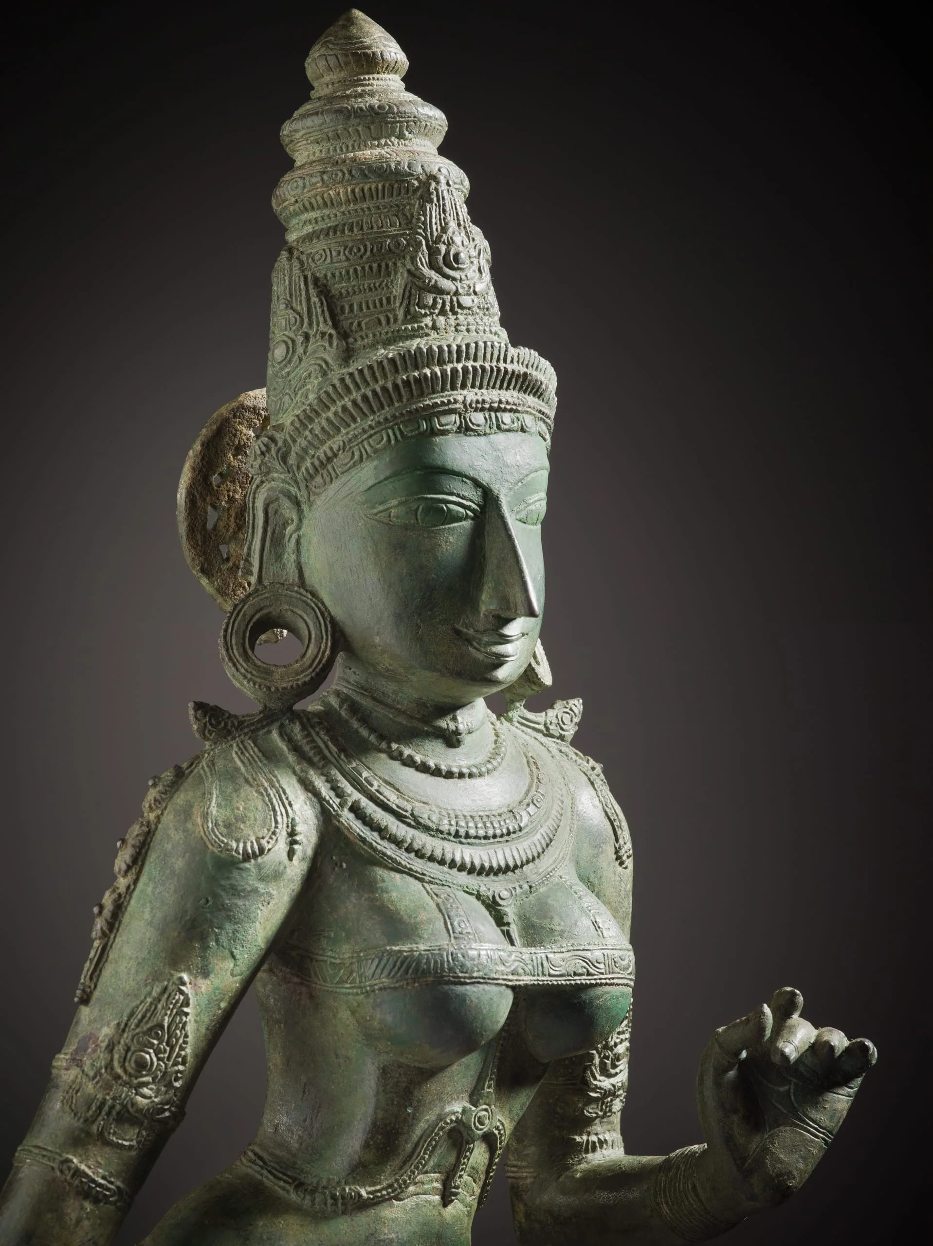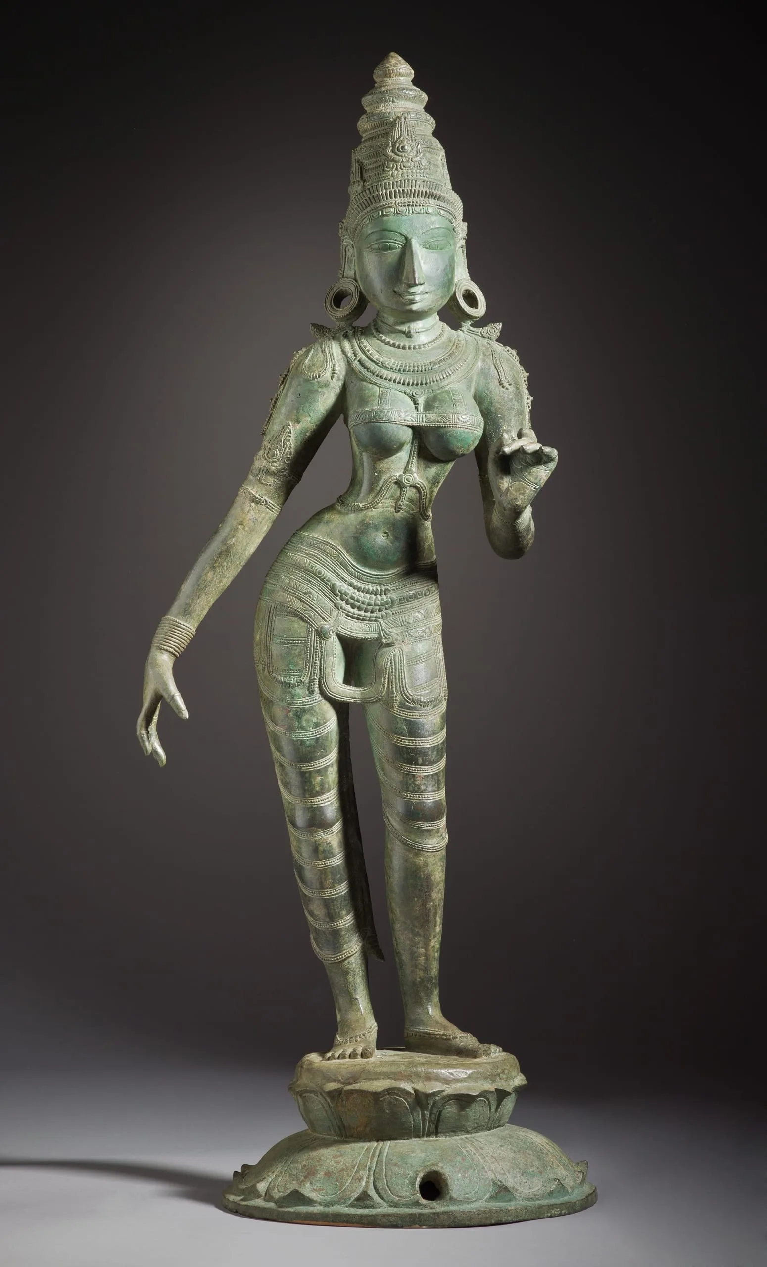 These separate copper alloy (bronze) representations of the Hindu god Vishnu flanked by his wives Shridevi (or Lakshmi) and the earth goddess Bhudevi form a Vaishnava matrimonial triad (M.70.5.1-.3). Originally made as processional images, each deity stands on a double lotus base cut with holes for attaching them to the support poles.