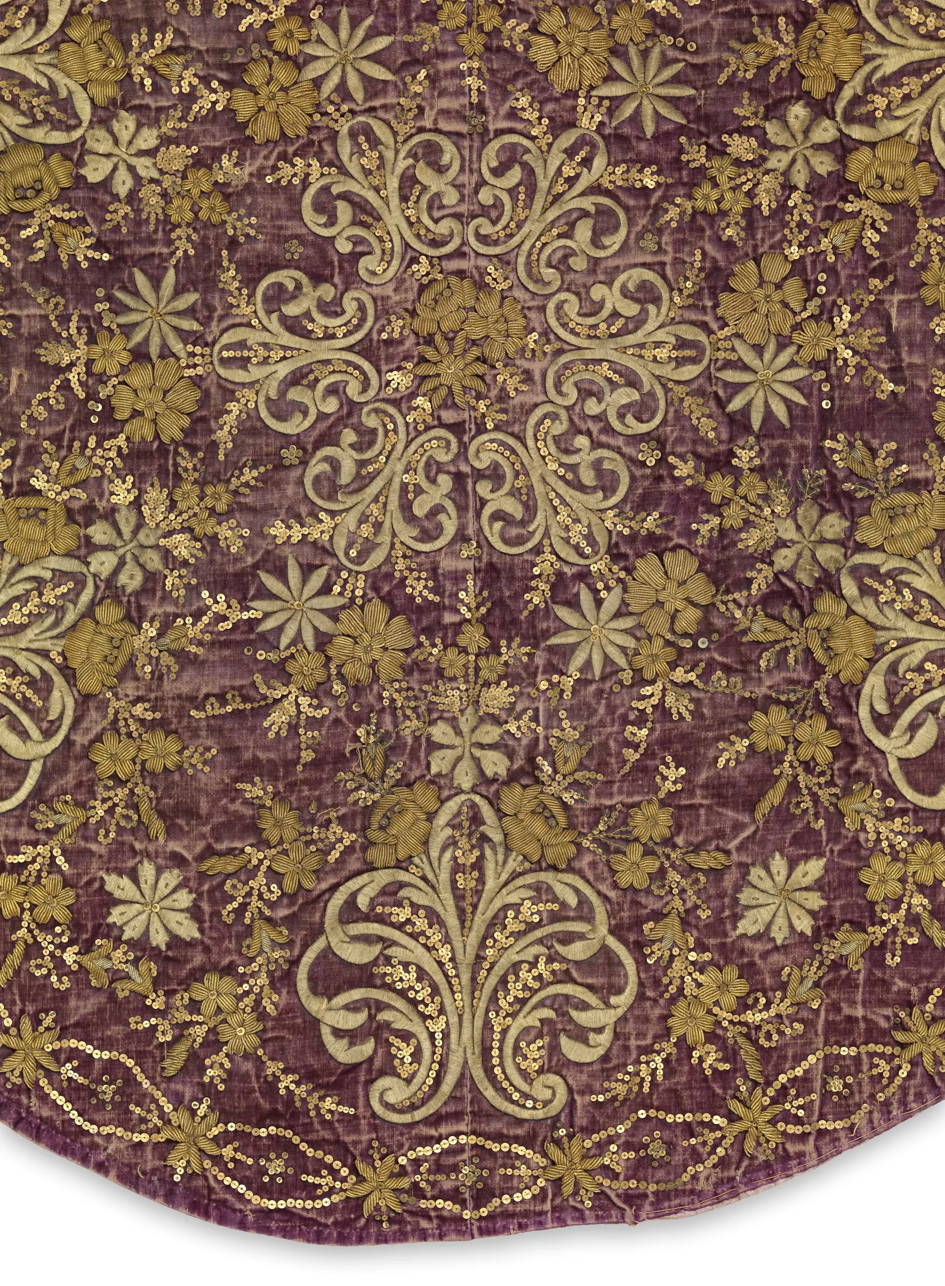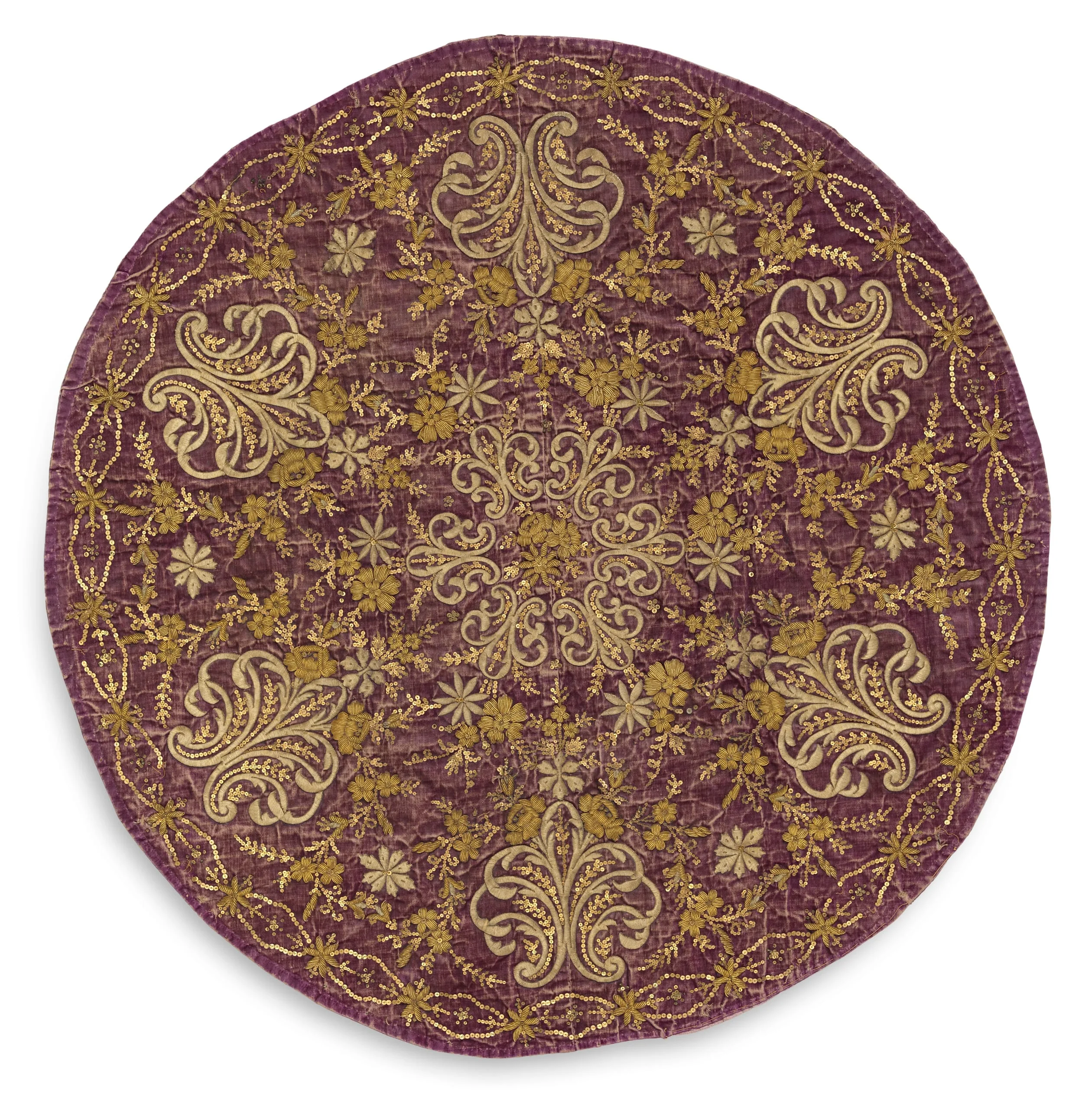 In large parts of the Islamic world, including the Ottoman empire, sufra, the Persian word for the fabric covering the dining surface, came to signify any place from which food was served—not unlike a dining table. In urban Ottoman households, the sufra was traditionally rectangular in shape and used as a dining space on the floor. Trays on stands could then be set on top to provide an elevated position, making them more accessible to those seated nearby. Known in Ottoman usage as a sufra bezi, tray covers not only protected the surface beneath but provided a beautiful mise en placefor a coffee service (cat. 129b) or a small meal as might have been served in Ottoman era palaces and elite households. The sufra bezi, also known as nihali, as here, made of velvet, satin, or leather, and laid inside round trays, became common by the mid- to late eighteenth century. Offering coffee to guests was a particularly important practice among the affluent citizens of Ottoman lands, and the wealth and success of the household were reflected not only in the opulence of the serving pieces but in the tray cover. These two brilliantly colored and elaborately decorated examples would have added to the delectation of the guests.