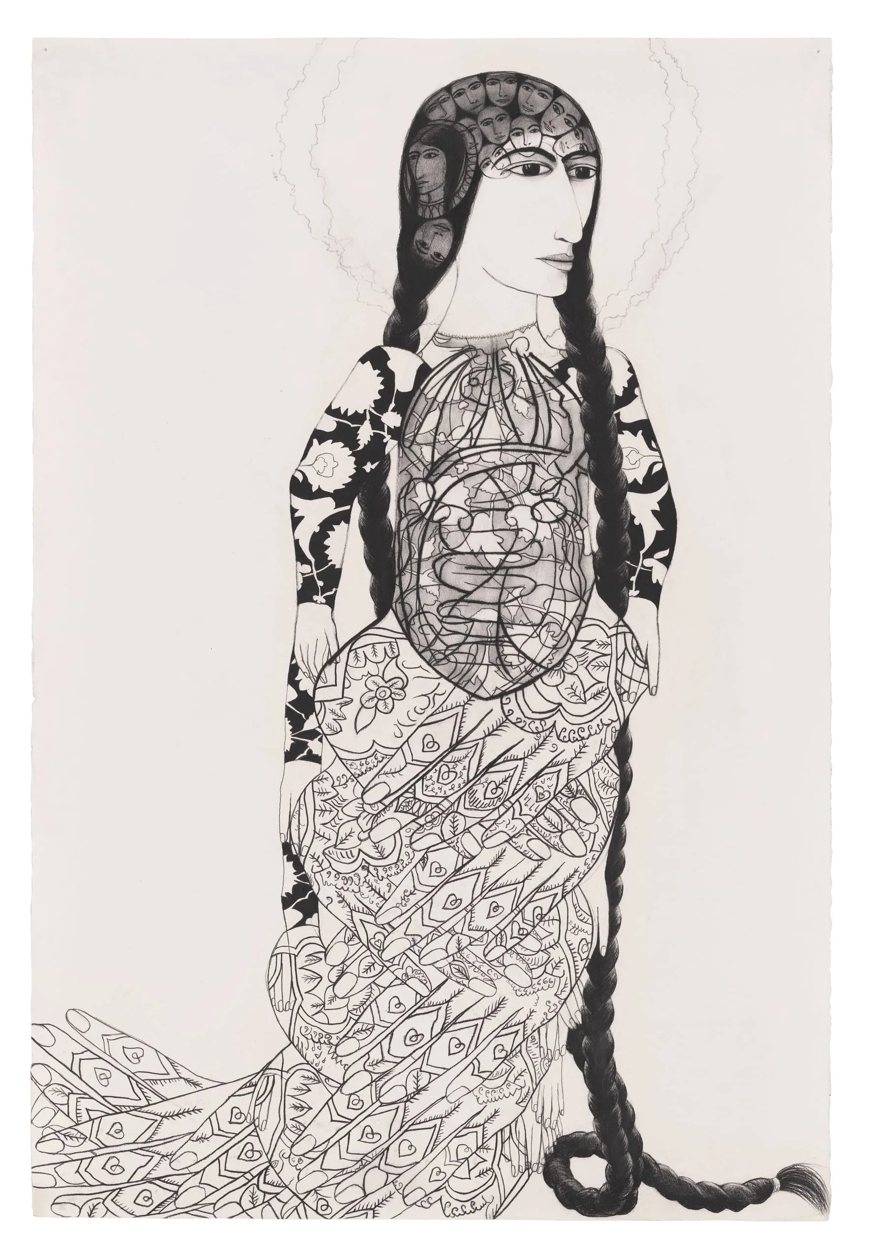 borrowed from medieval Persian anatomical drawings. Despite the woman’s placid expression, the faces that seemingly crowd