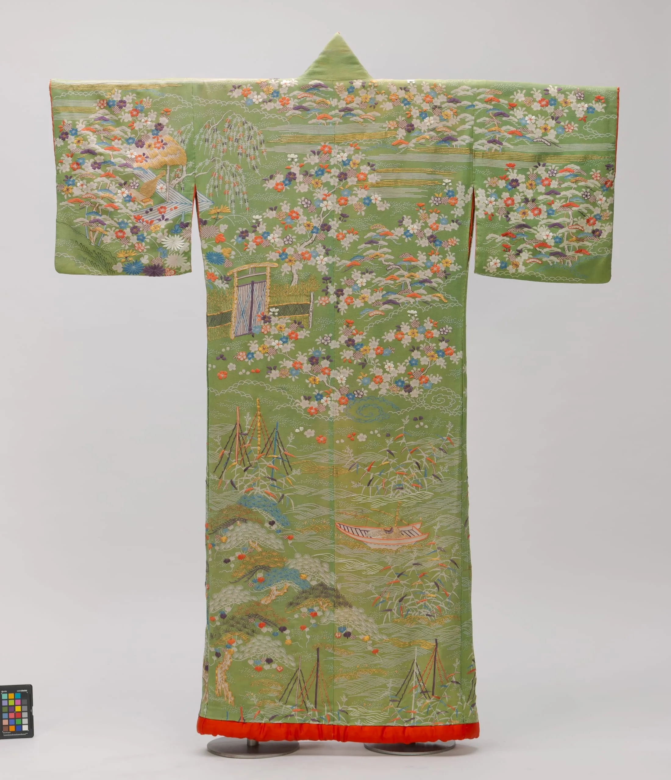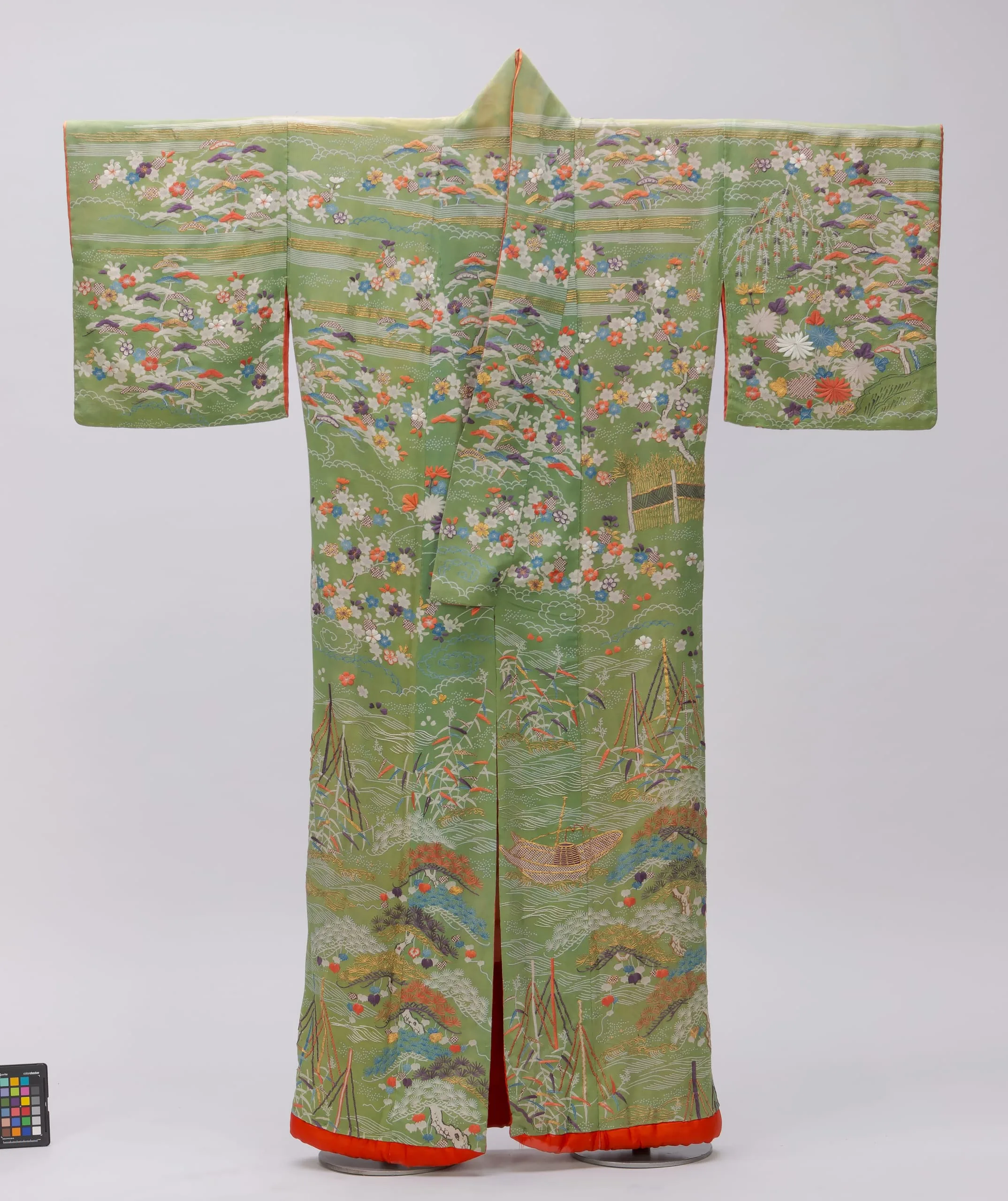 - Silk crepe (chirimen), paste-resist dyed (yūzen), stenciled imitation tie-resist dyed (kata kanoko), silk and gilt-paper-wrapped-silk-thread embroidery