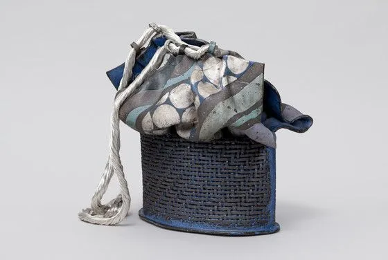 - Stoneware with overglaze enamels, white silk cord threads wrapped in white metal foils