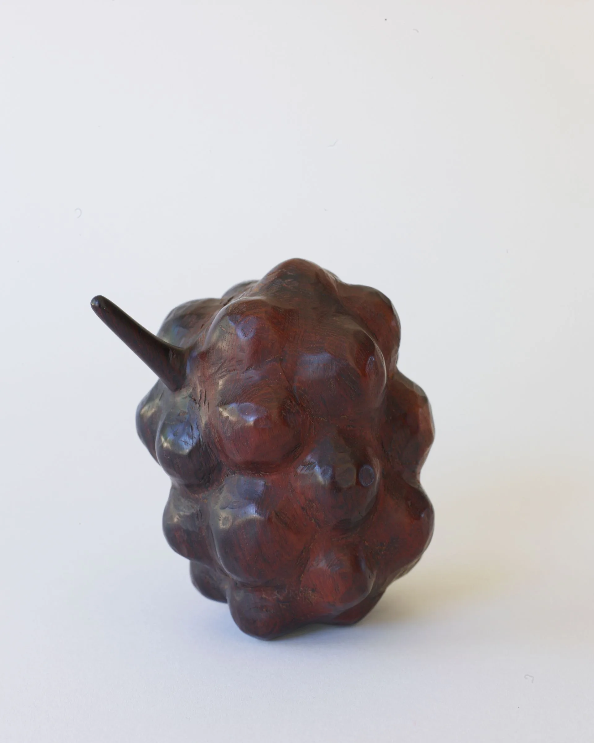 Small glazed ceramic sculpture with a bumpy, lobe-covered surface in deep burgundy and purple, with a single tapered spike protruding from the top