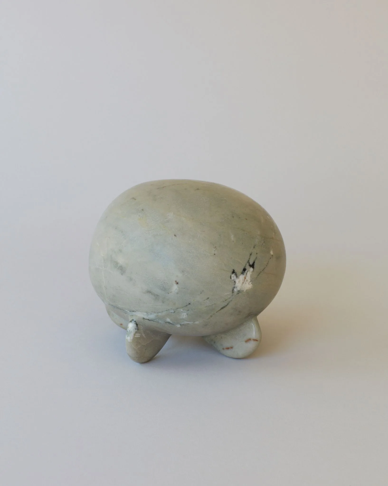 Small ceramic sculpture, a smooth spherical form in sage green and gray glaze resting on three stubby feet, with a chipped area exposing the white clay body beneath