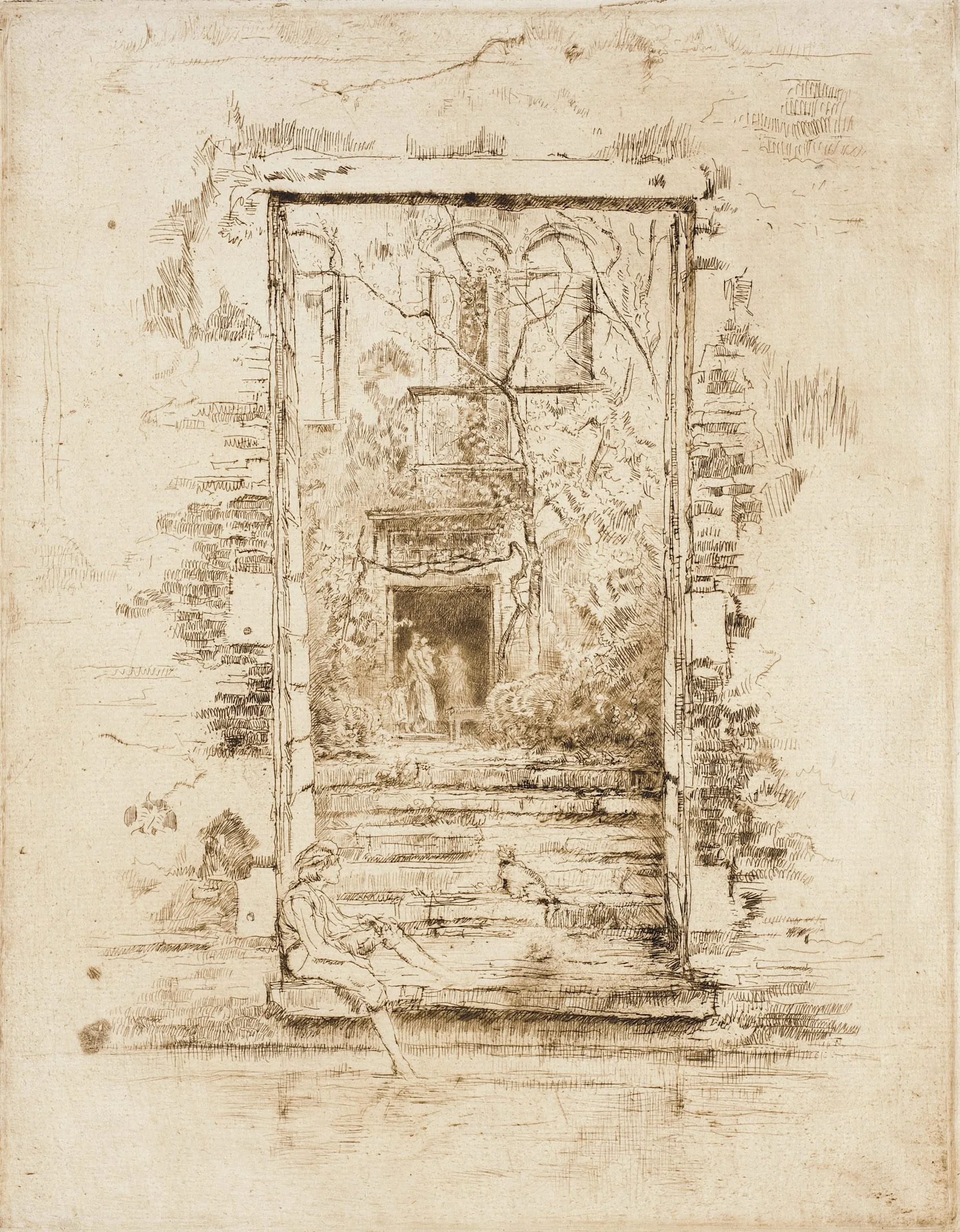 Whistler compressed the perspectival view from across the canal into this garden so that the textures and lines of the crumbling walls, tree branches, and garden blend together flatly. His glimpse into everyday private life in Venice emphasizes aesthetics over realistic depiction.