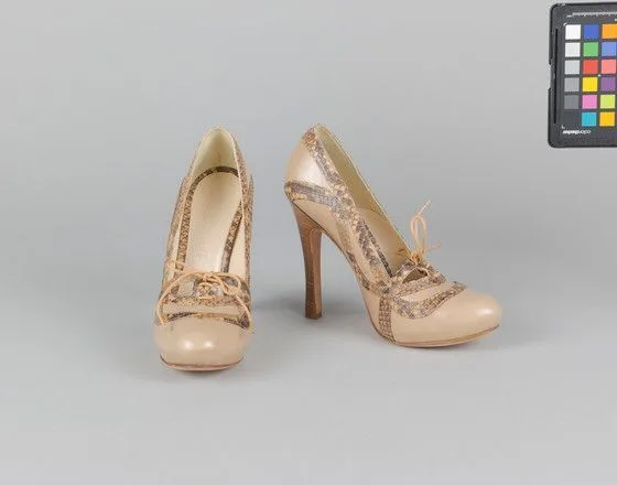 Pair of cream leather stiletto heels with diagonal snakeskin-patterned straps across the vamp and small lace-up bow detail, displayed on a gray background