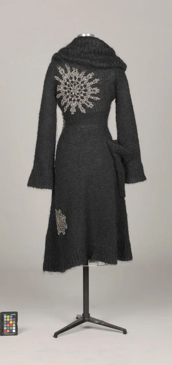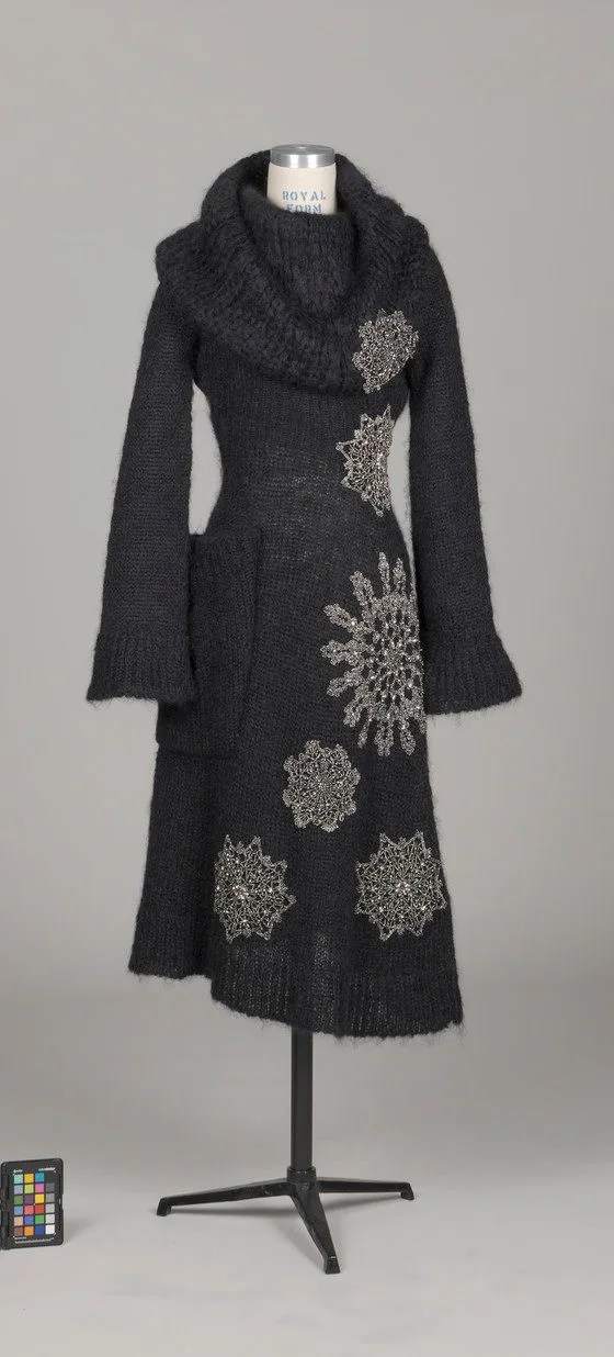 Long charcoal-gray knitted coat on a dressmaker's mannequin, with a wide draped collar and two white lace medallion appliqués on the back and lower front