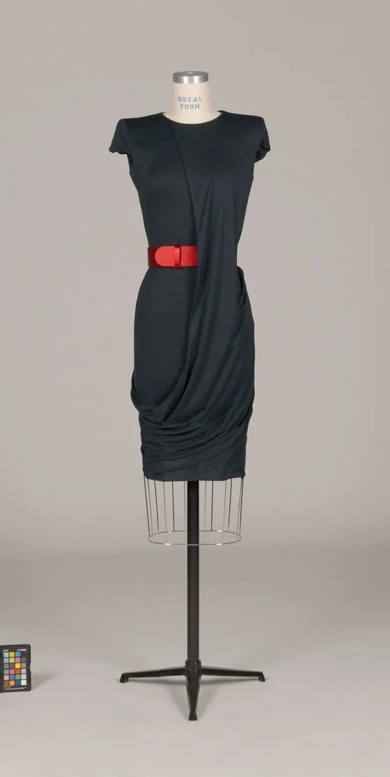 - Dress (a): Rayon knit; Belt (b): Leather and silk satin