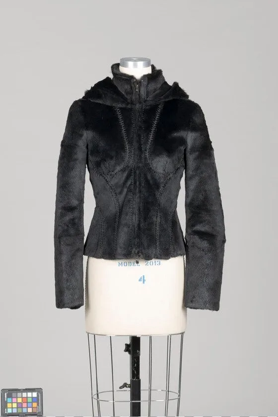 Fitted black fur or fur-like jacket with radiating whipstitched seams and center zipper, displayed on a cream dress form