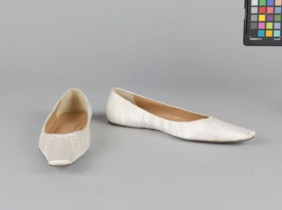Pair of flat, ivory fabric slip-on shoes with sharply pointed toes and crinkled textile uppers; one upright, one on its side