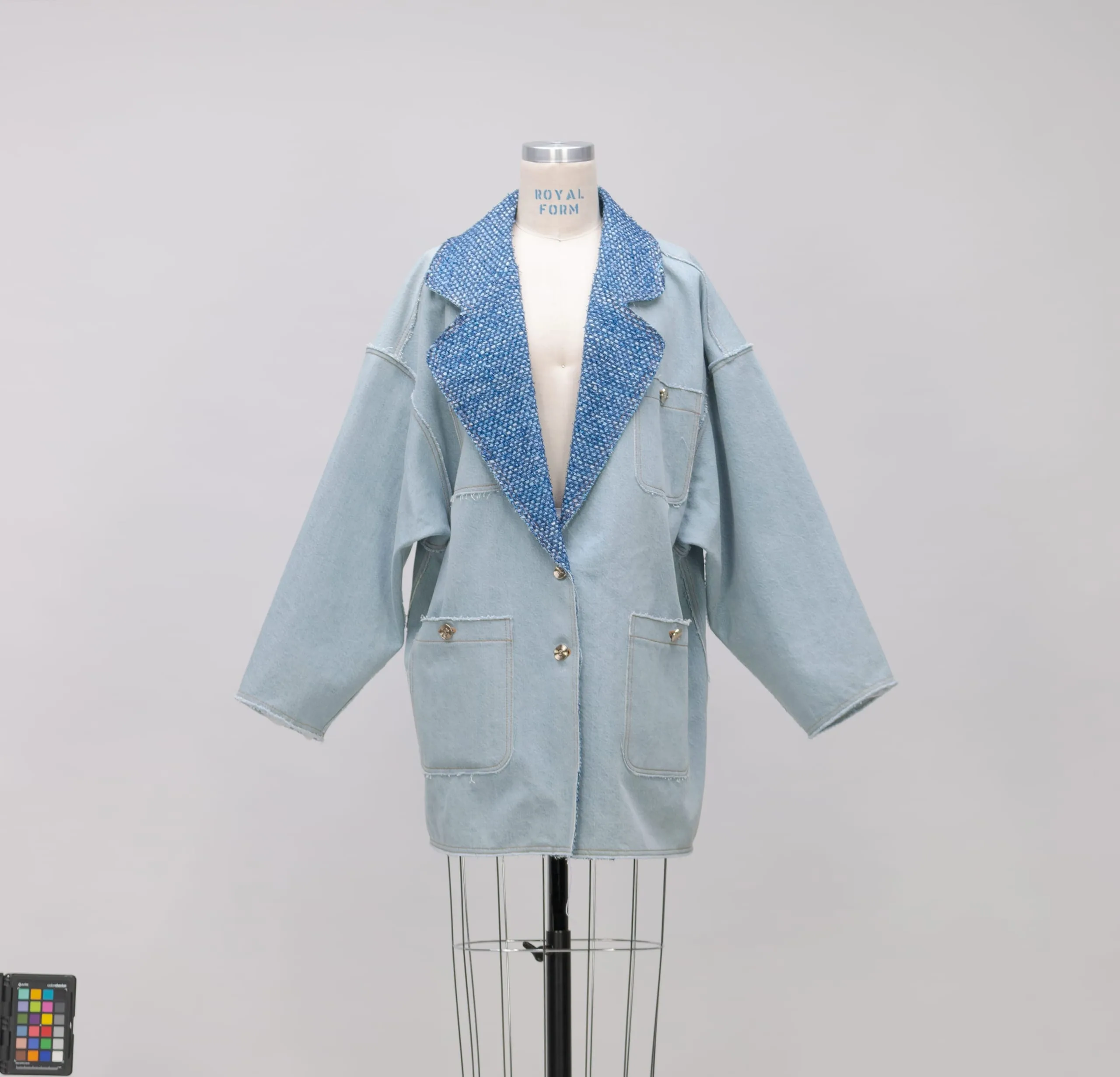 - Cotton twill weave (denim) with cotton, polyester, polyamide, and wool (bouclé) twill weave, with metal buttons