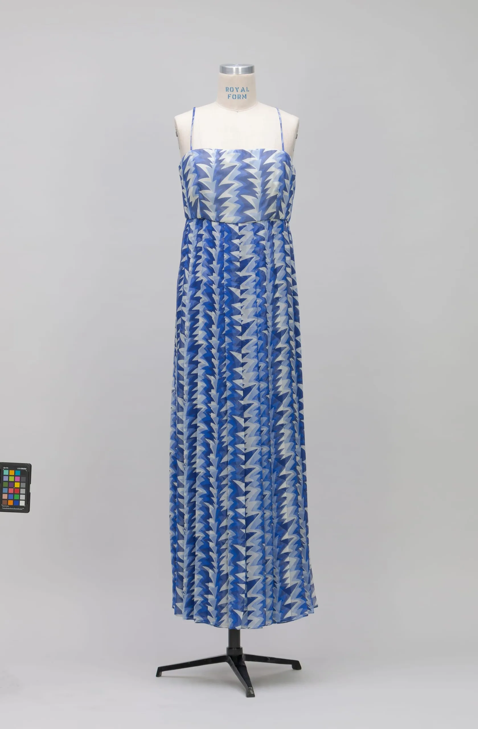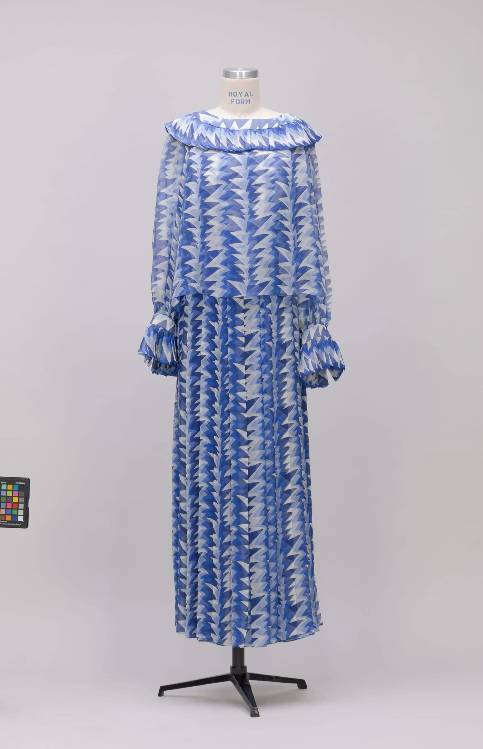 - Dress: Silk plain weave (crepe), printed with metal stud; Blouse: Silk plain weave (crepe), printed with metal buttons