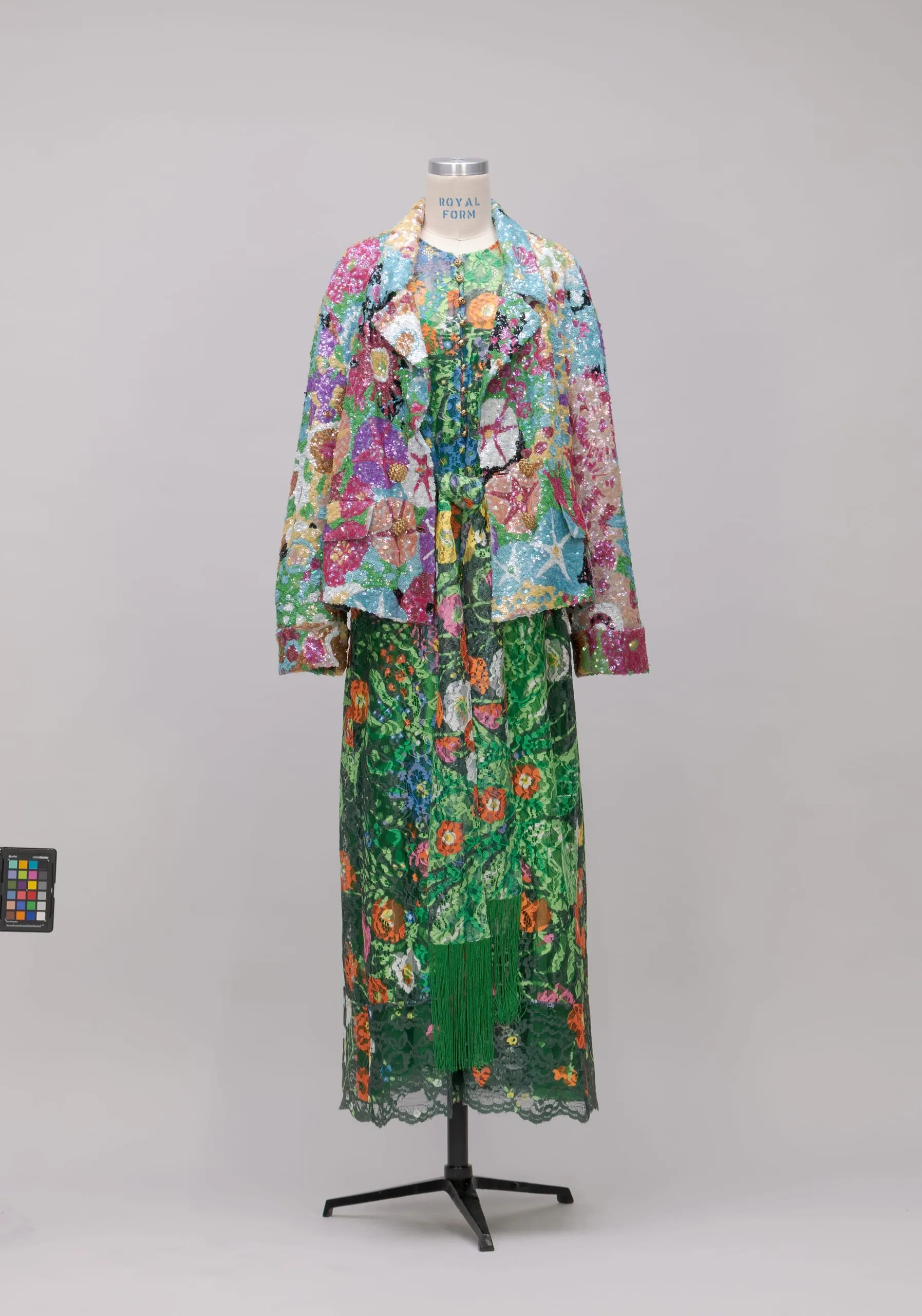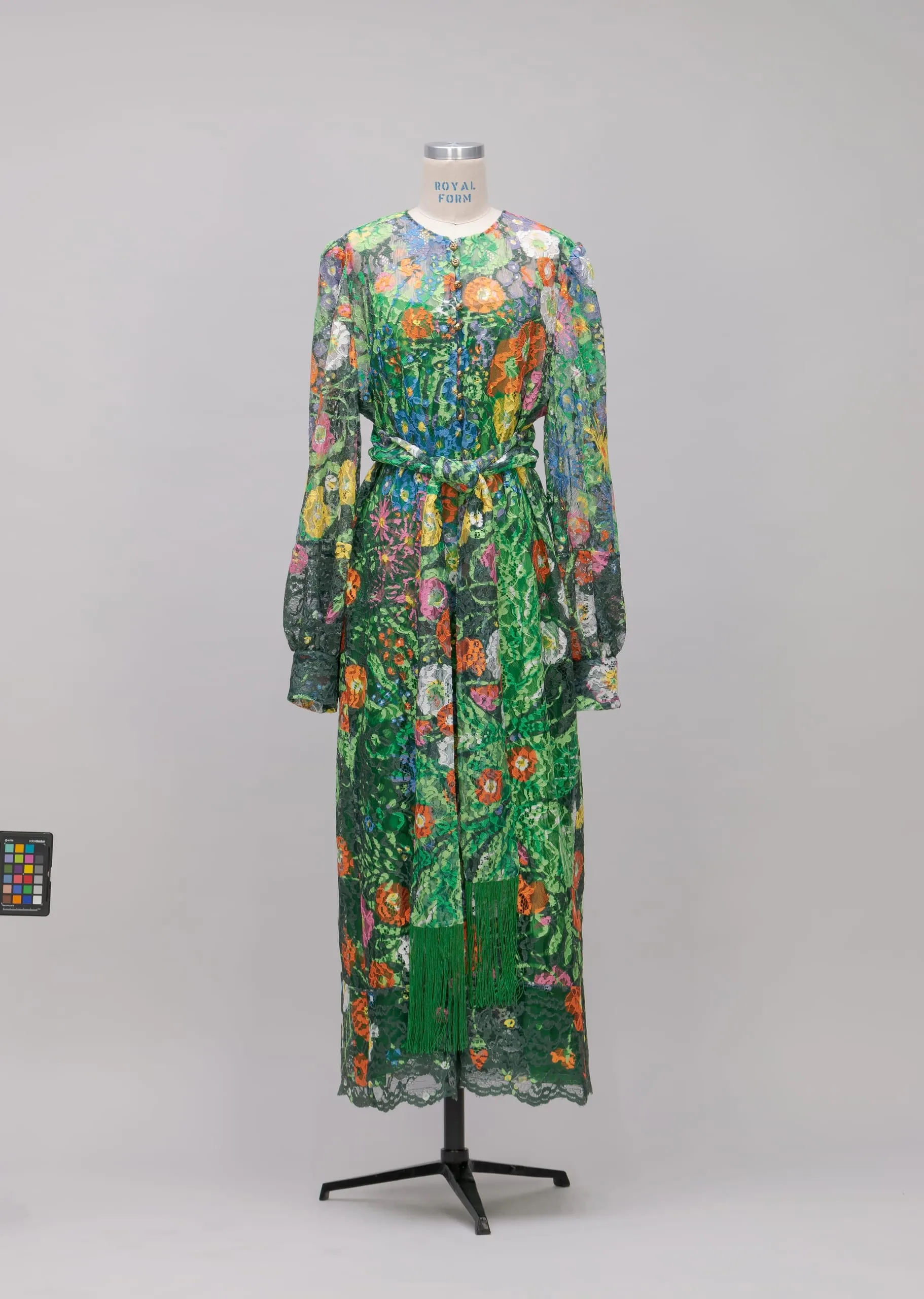 Sash: Acetate/silk machine lace, printed with polyamide fringe