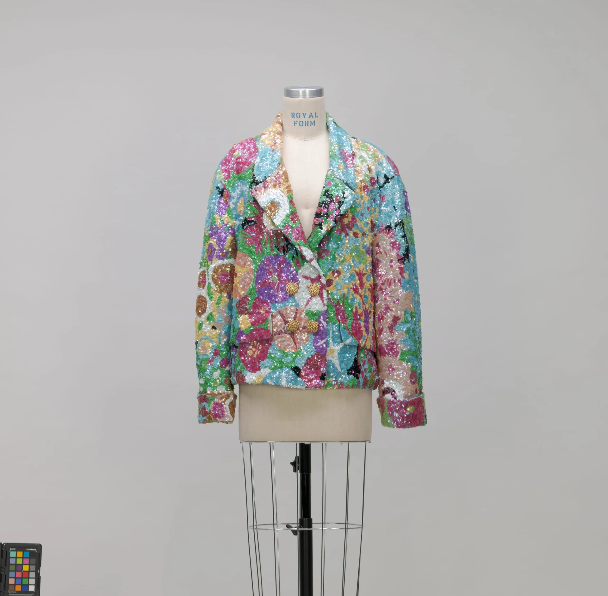 - Jacket: Silk twill weave (crepe georgette) with plastic sequins and metal buttons