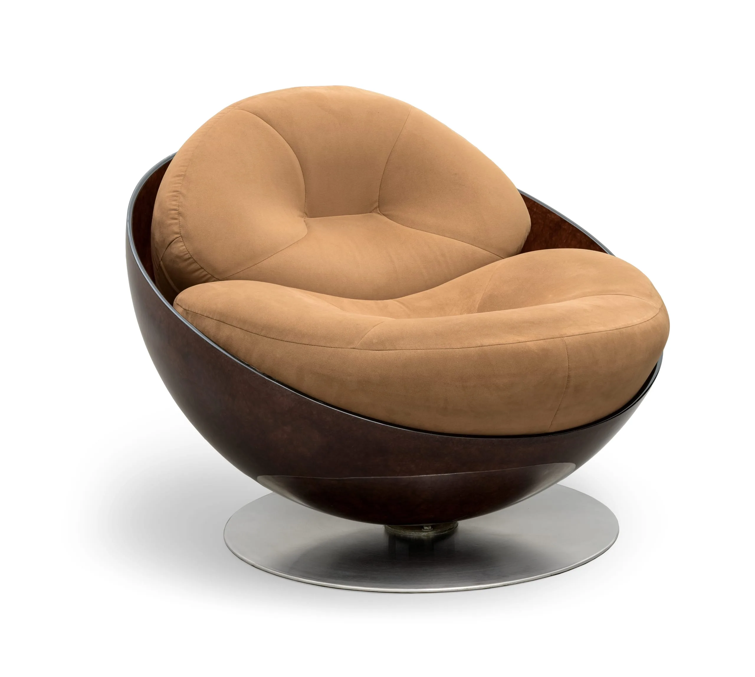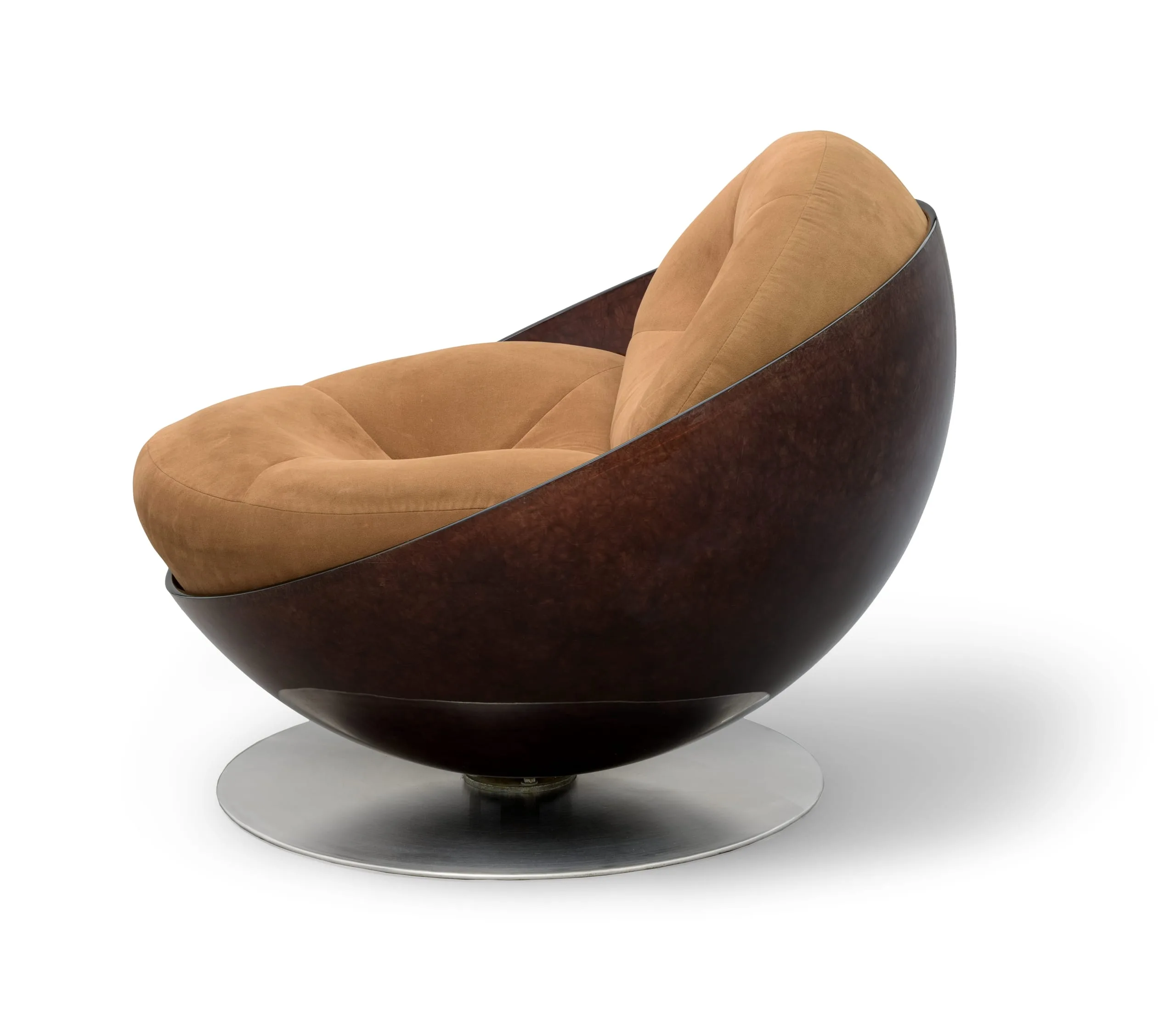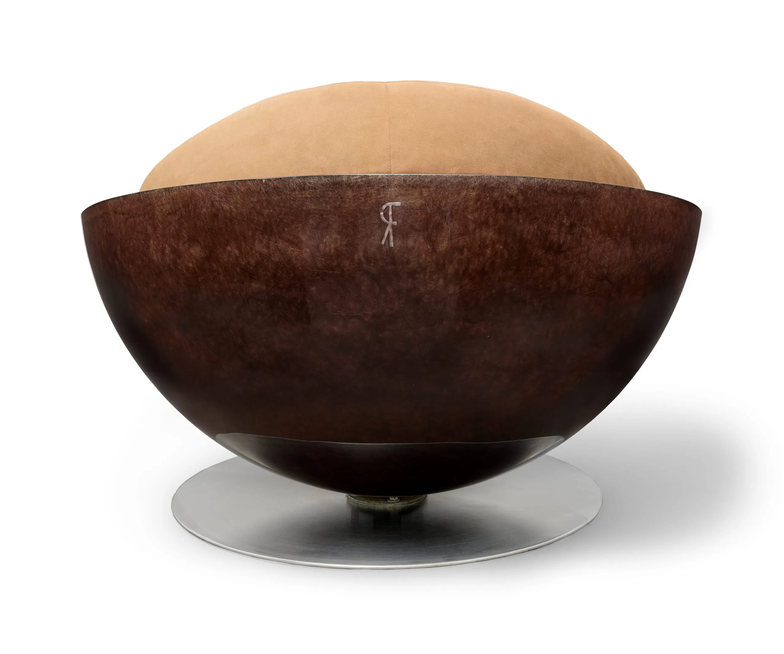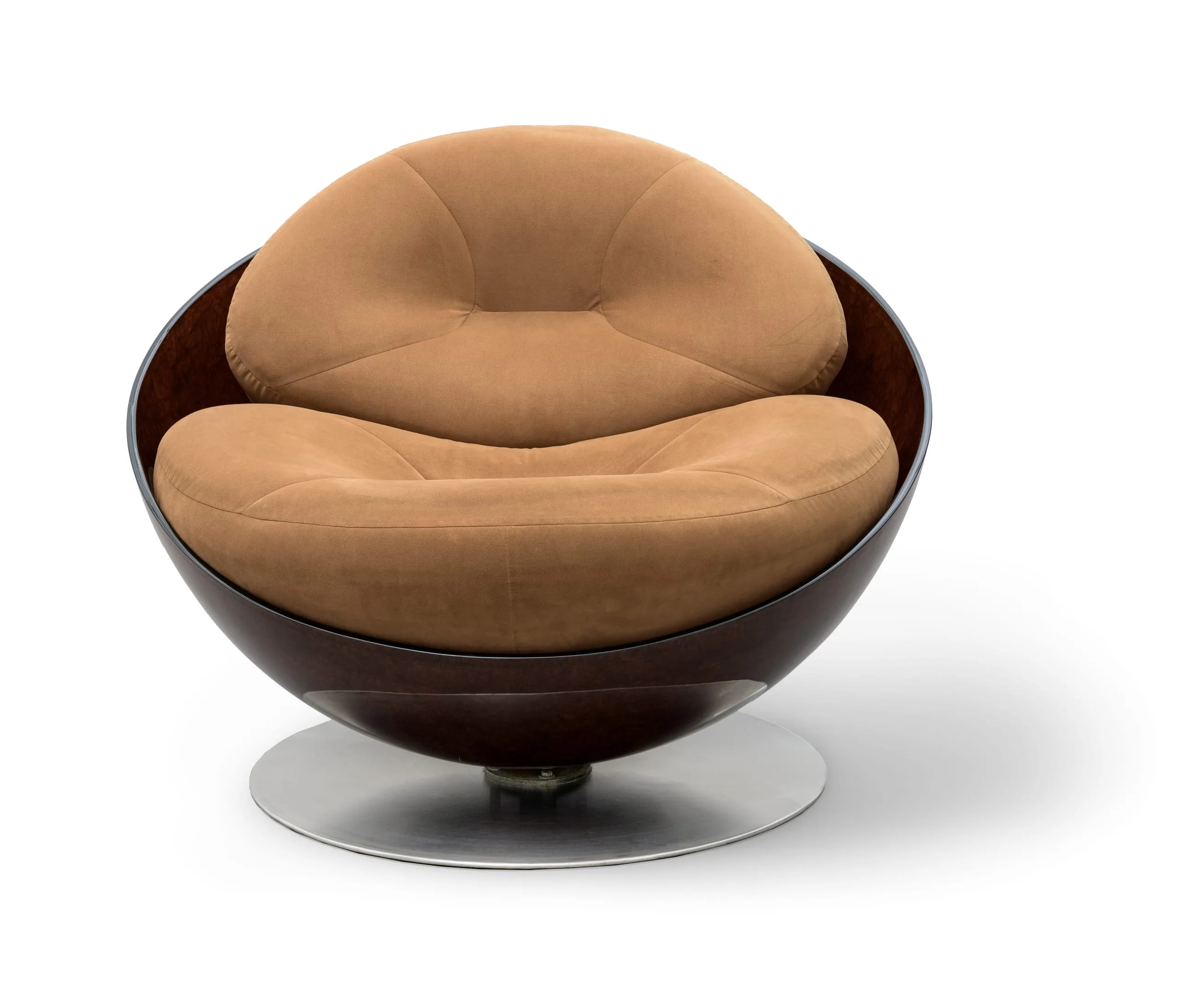 The Esfera (Sphere) lounge armchair, first created in 1968, is one of Fasanello’s most famous designs. The designer employed his signature tortoiseshell fiberglass to fashion a half-sphere in which sit suede cushions. This futuristic design reimagines the silhouette of the chair, reflecting Fasanello’s lifelong fascination with speed and aerodynamics. LACMA’s chair swivels on a stainless steel base, which Fasanello used only in his earliest versions of the Esfera. In later versions of the chair, which remain in production to this day, Fasanello replaced the metal base with fiberglass to make the chair lighter. This Esfera is one of two sold to Brazilian ambassador Italo Mastrogiovanni in 1974. Mastrogiovanni’s pair of chairs traveled the world to the ambassador’s postings in Geneva, Porto, and Abidjan, showcasing Brazilian design on an international scale before returning to São Paulo.
