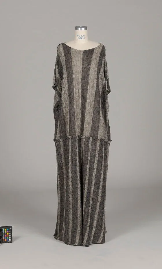 Two-piece fashion ensemble on a dress form: boxy short-sleeved top and wide-leg trousers in vertically striped charcoal, taupe, and silver woven fabric with a crinkled texture