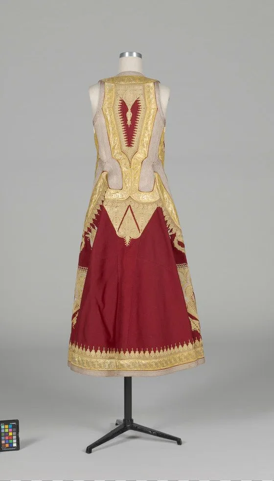 - Wool plain weave (broadcloth) with metallic-thread braid embroidery