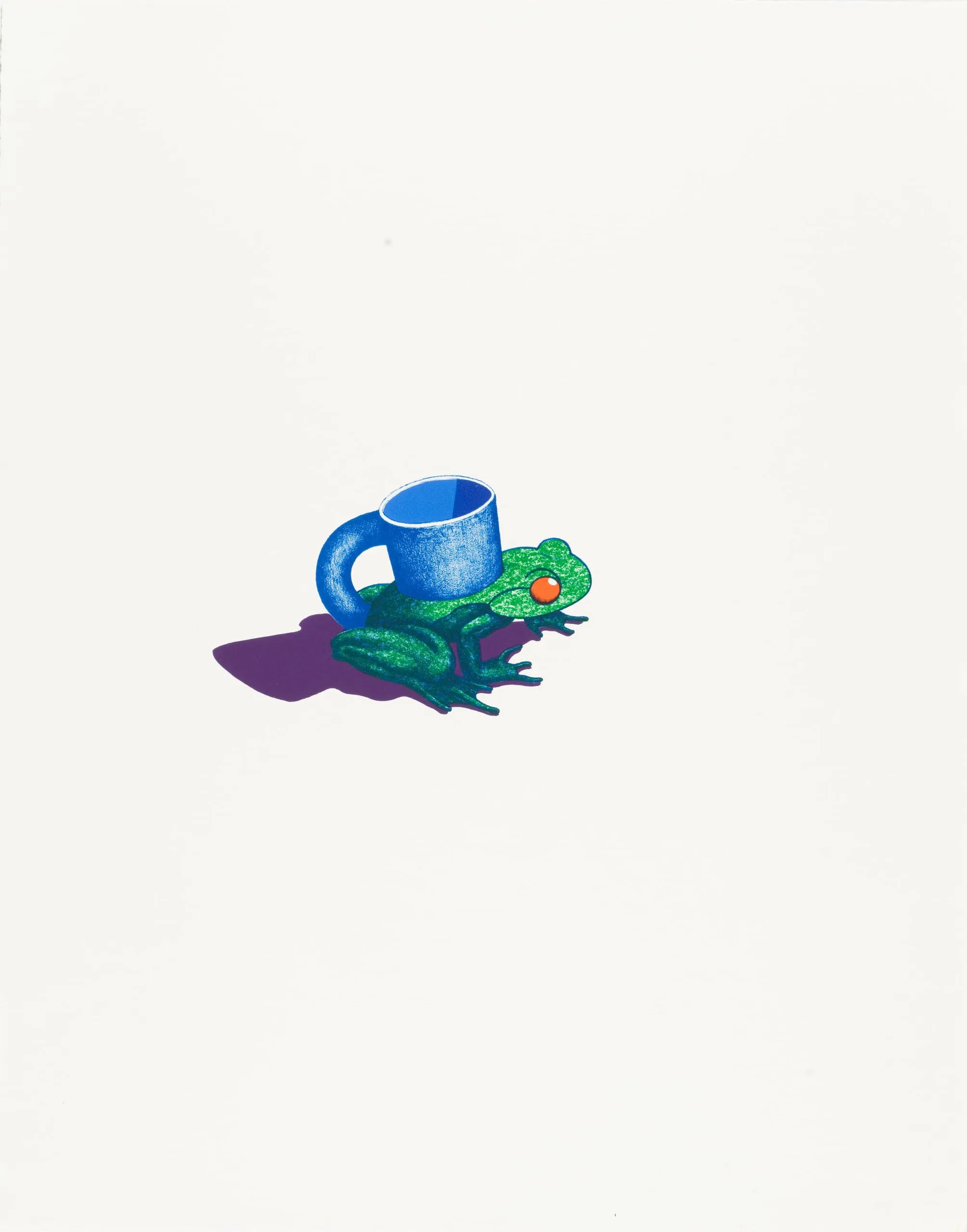 Screenprint of a blue stippled coffee mug resting on the back of a green frog with a red eye, casting a purple shadow on white paper
