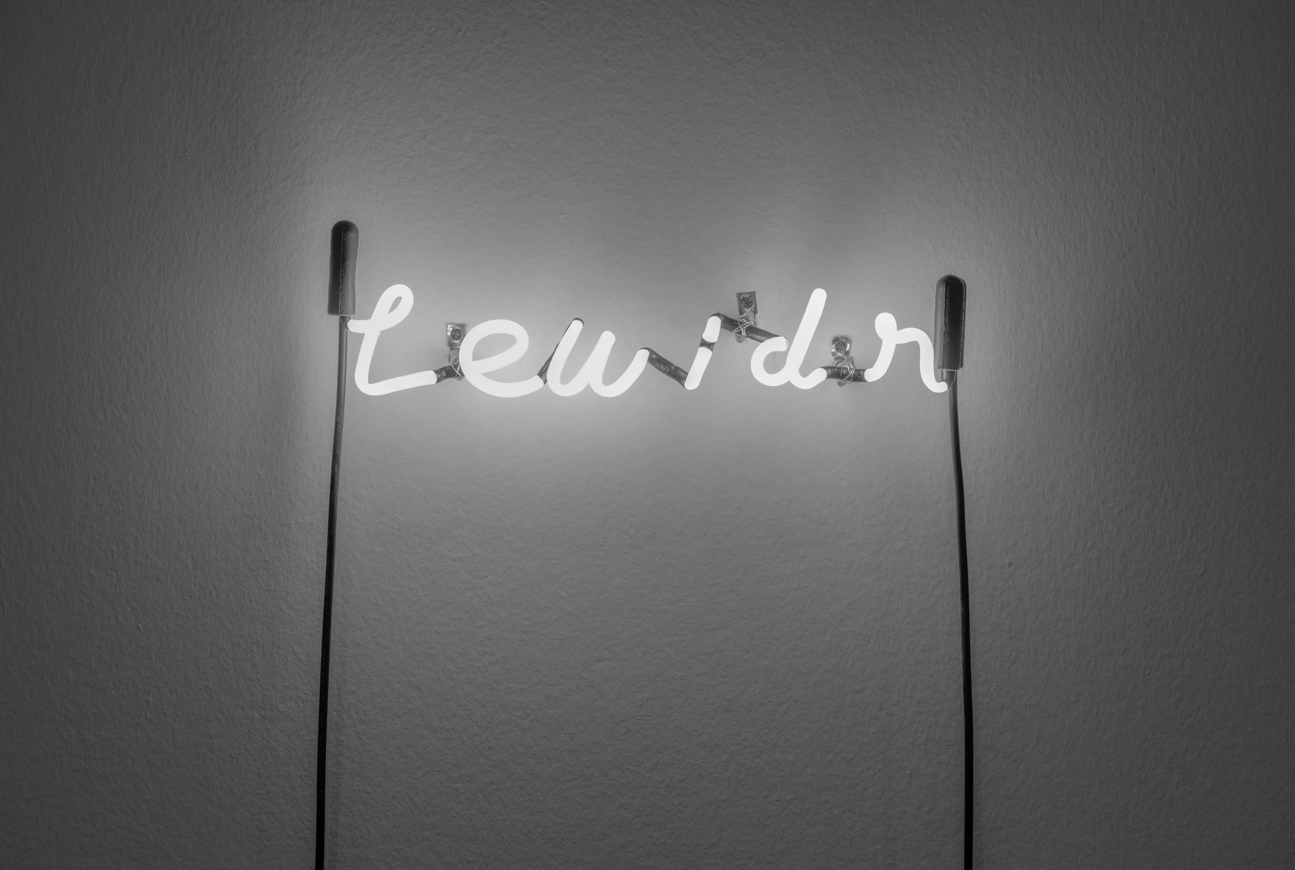 Conceptual artist Bruce Nauman had his first solo show at the esteemed Nicholas Wilder Gallery on La Cienega Boulevard in Los Angeles in May of 1966 and went on to have three other solo shows there by 1977. Typical of Nauman's ongoing interest in wordplay, Lewidr is a neon anagram of Wilder’s last name. Not only is it a play on the name of the artist’s first dealer, but it also makes a sly sexual reference. According to Wilder, “Nauman humorously referred to the ‘virgin white’ color of the piece, which contrasts with the ‘lewd’ness suggested by the anagram’s presumed pronunciation.” That same year Nauman made a similar neon “scrambling” of renowned art dealer Leo Castelli’s last name, titled Ill Caste.