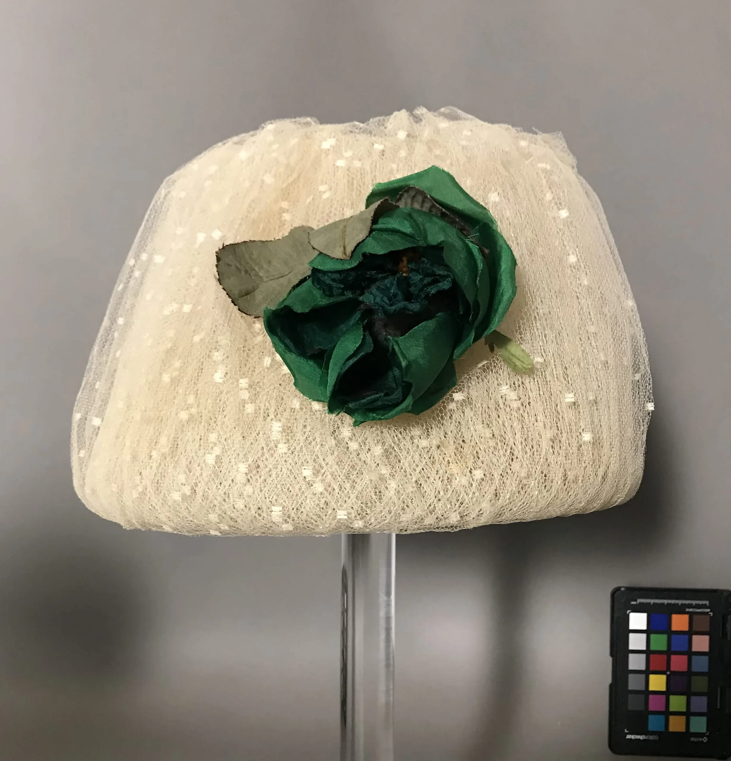 Dome-shaped hat covered in ivory dotted tulle netting, with a large emerald green silk rose and sage green leaves pinned to the front, displayed on a clear acrylic stand