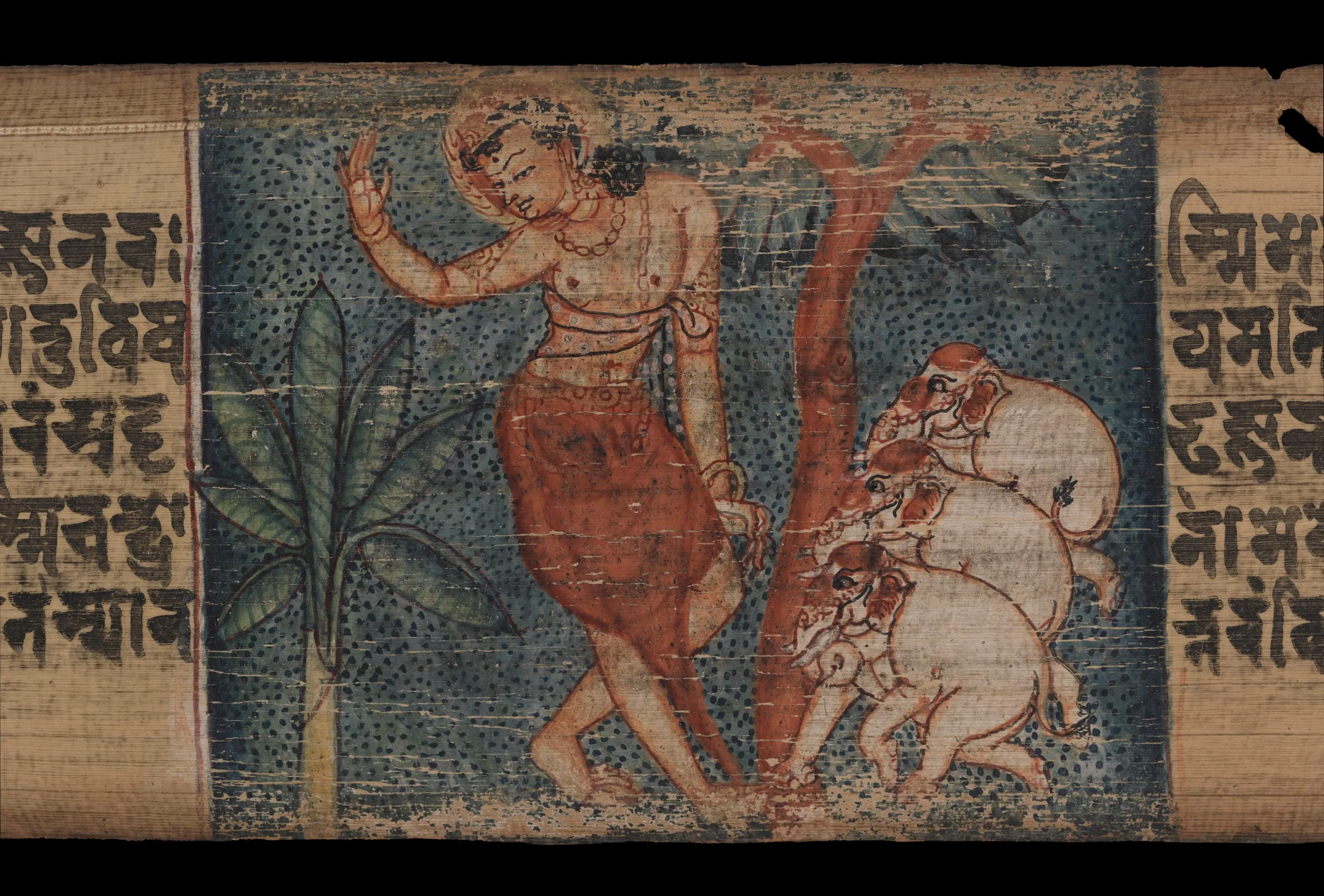 Folios a-c feature pointilistic dots in the background. Typical of paintings from the Kathmandu Valley, the tall, lithe figures are gracefully posed and the drawing is fine and elegant. Even though there is only minimal shading of some receding areas, the quality of line and juxtaposition of colors create an impression of three-dimensional space. A landscape setting for some of the scenes is indicated by the stylized rock form conventions also found in Nepalese sculpture (for example, see M.75.4.15, M.81.23, and M.2002.215).