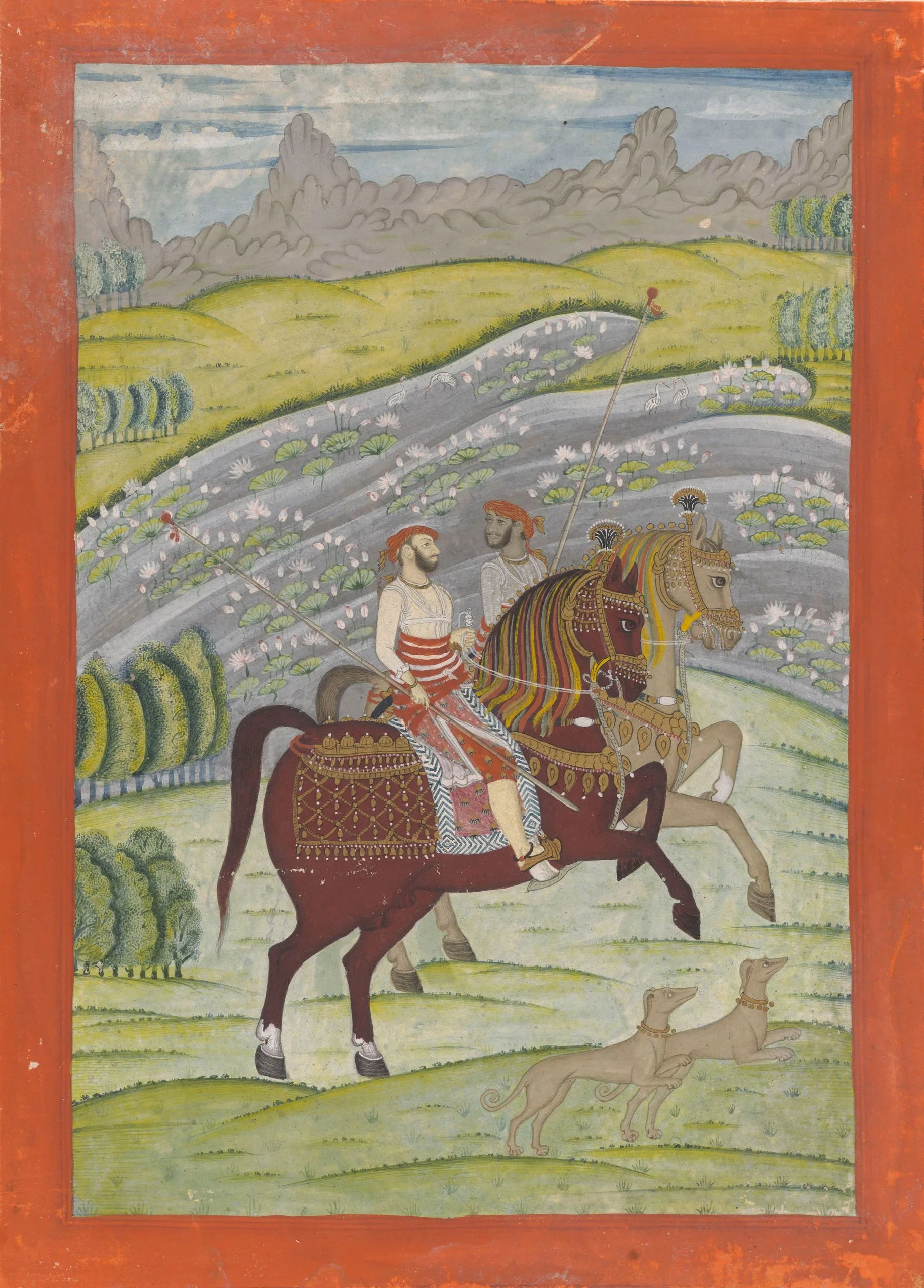 Rao Shatrujit Singh (r. 1762-1801), shown in profile, was the sixth ruler of Datia, a small kingdom in the Bundelkhand region of present-day Madhya Pradesh founded in 1626 by Rao Bhagwan Singh (r. 1626-1656). Datia was originally part of Orchha (founded in 1531) and came under British control with other central Indian princely states under the Treaty of Bassein in 1802. Shatrujit Singh was known as one of Datia’s most gallant rulers. He increased its territory and effectively repulsed external threats. In 1801 he fell in battle against the army of the Maratha leader, Daulat Rao Sindhia (1794-1827). In this painting, Shatrujit Singh sits astride his favorite horse, a chestnut stallion named Hayaraja ("king of horses"). He and his unknown companion each wear a distinctive central Indian flat turban. They each carry what appears to be a pole mace (gada) with a long annular pattern haft and red tassels. Shatrujit Singh is portrayed in the facial profile view traditionally used for Indian rulers, but his companion is shown with a three-quarter view face, which likely reflects perspectival assimilation from European artistic traditions introduced via the Mughals. The riders are accompanied by two saluki hunting dogs whose leaping postures mimic the galloping horses. Behind the figures is a lotus pond and mountainous landscape. A comparable portrait of Shatrujit Singh is in the Chazen Museum of Art, University of Wisconsin–Madison (2005.1.10).
