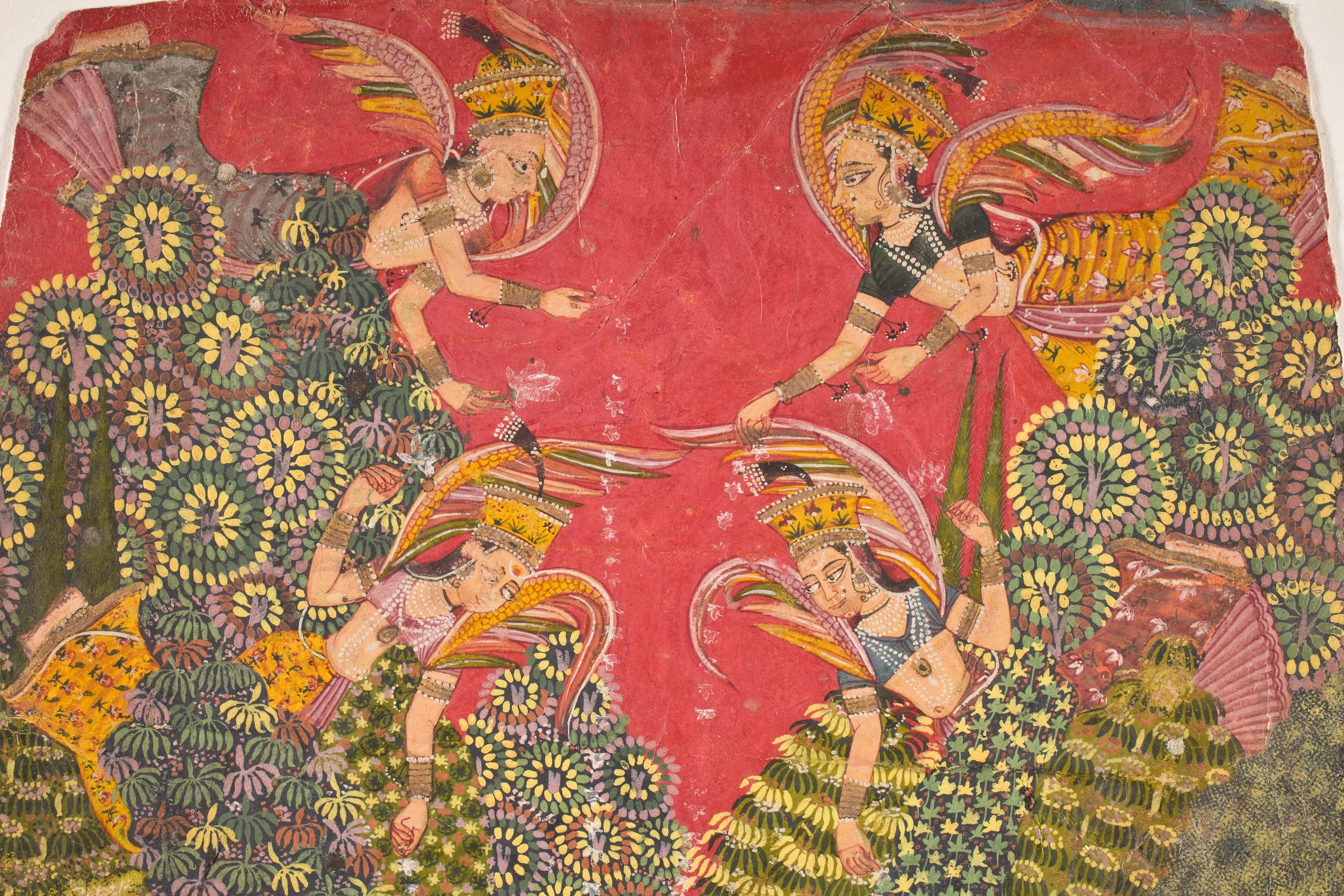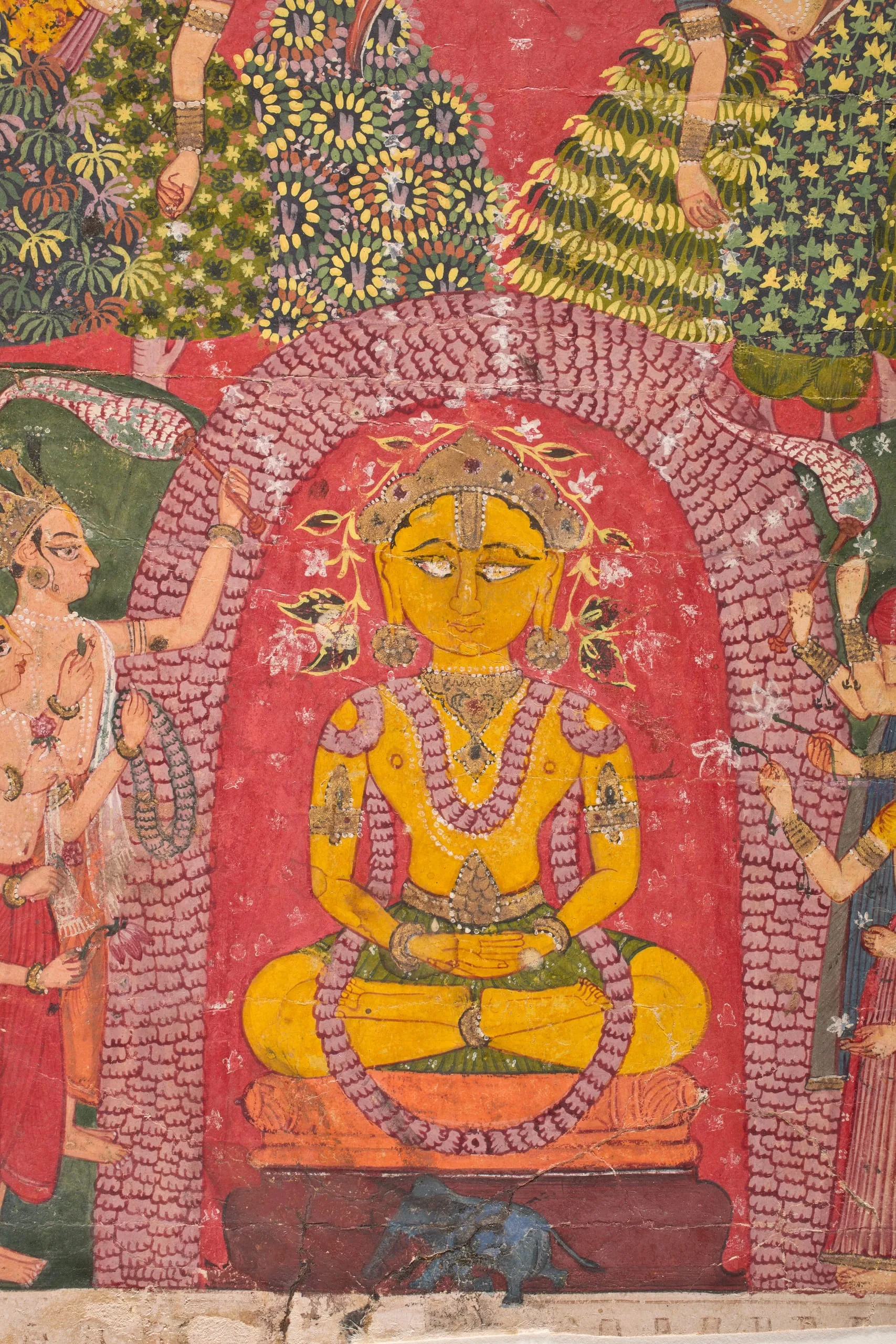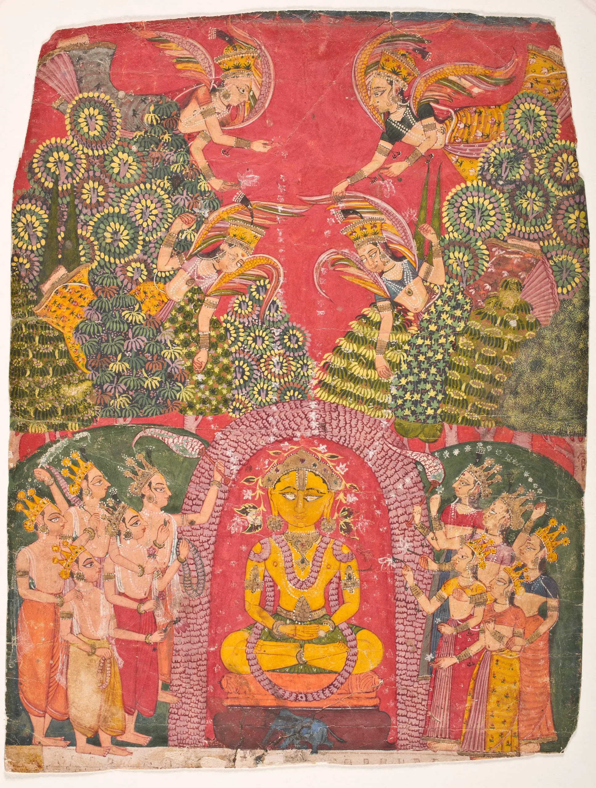 Jina Ajitanatha is the second Jain savior (tirthankara) of the present time cycle of Jain cosmology. He is seated in a floral bower with his identifying symbol, an elephant, depicted on the base of his throne pedestal. Ajitanatha is painted a golden color, per the iconographic stipulations of Jain texts. He wears a floral garland and a bejeweled crown and ornaments. Crowned divinities stand beside him waiving honorific flywhisks and making offerings of blossoms and garlands. Celestial females flying overhead shower him with flower petals. The devotional scene is set in the forest amidst a marvelous riot of vegetation. The specific event portrayed may be Ajitanatha receiving homage in heaven from the gods before his descent to mortal existence or the worship of his image as a form of darshana (spiritual viewing) prior to the commencement of the narration of his life during Jain rituals.