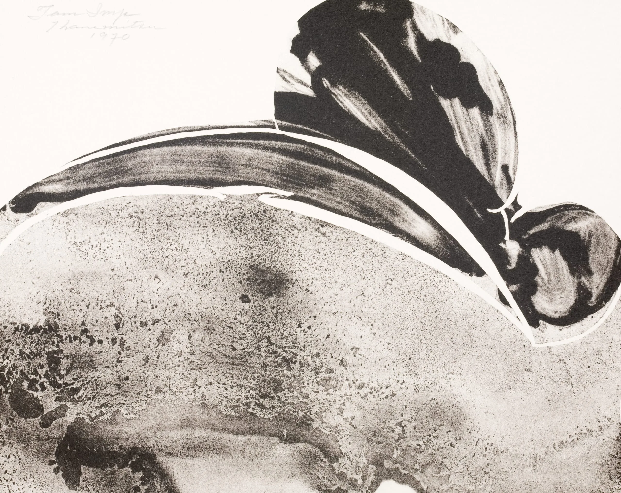 Print in black ink on cream paper, abstracted rounded form with mottled gray texture topped by a bold, curving brushstroke shape, handwritten inscription in upper left