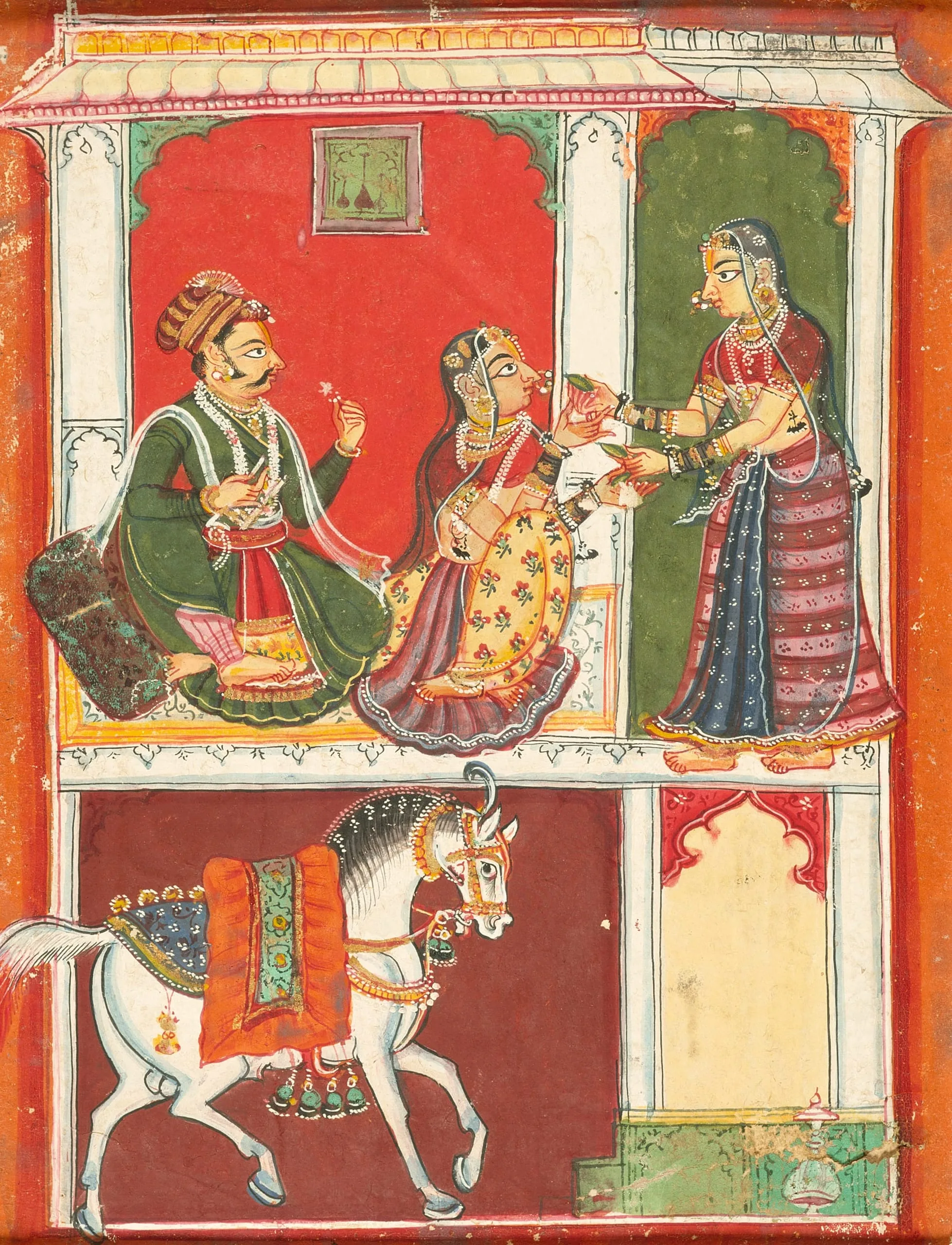The devanagari inscription (bottom left of the folio, not visible in photo) identifies Desavarari Ragini by the alternate spelling of “Desavari Ragani.” It is the fourth wife of Dipak Raga in the variant ragamala (garland of melodies) classification system followed in the princely state of Sirohi, Rajasthan. This is corroborated by the inscribed series number twenty-three (bottom right of folio, not visible in photo), which corresponds to Desavarari Ragini’s sequence in the Sirohi system. Desavarari Ragini is typically depicted as a woman with her torso twisted and her arms upraised and joined together. For example, see a Desavarari Ragini from Marwar (?) in the National Museum of Asian Art, Washington (S2018.1.52). Here, in accordance with the Sirohi system, the melody is personified as a heroine receiving betel nut quids (pan) from her maidservant to offer them to her lover, who has just arrived on his caparisoned horse shown waiting outside the pavilion. This alternative imagery resembles and is often labeled interchangeably with Bairadi Ragini, which is also the fourth wife of Dipak Raga in the predominant Rajasthani ragamala classification system. For example, see a Bairadi Ragini from Bikaner in the Metropolitan Museum of Art, New York (1981.464.1).