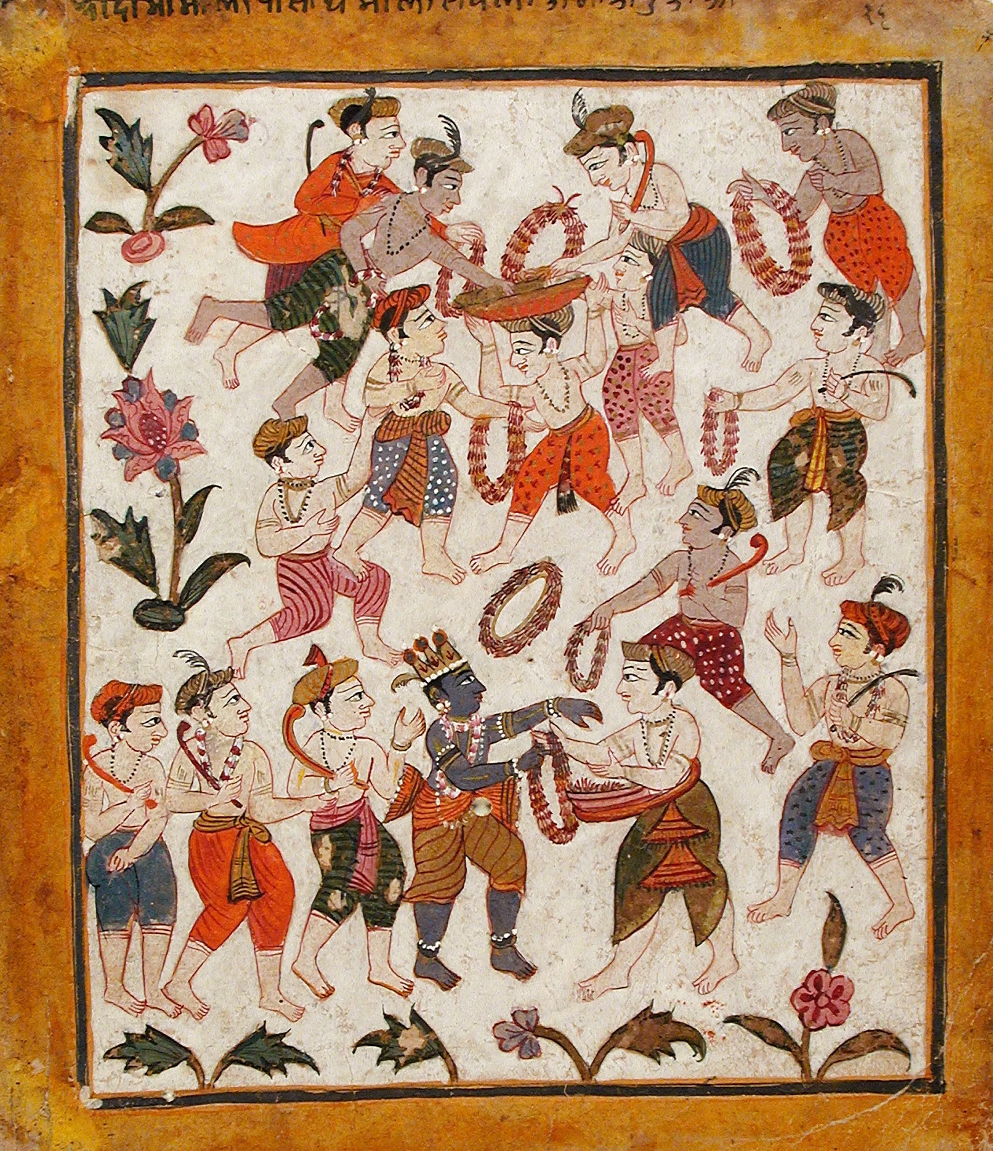 A partially visible devanagari caption in the upper border identifies the subject. When Krishna, Balarama, and their companion cowherders (gopas) entered Mathura they went to the house of the garland-maker Sudama, who honored them with water for ritual ablution, betel nut quids (pan), sandalwood paste, and garlands of fresh, fragrant flowers (Bhagavata Purana 10:41:43-52). Here, Krishna and the cowherds receive the garlands.