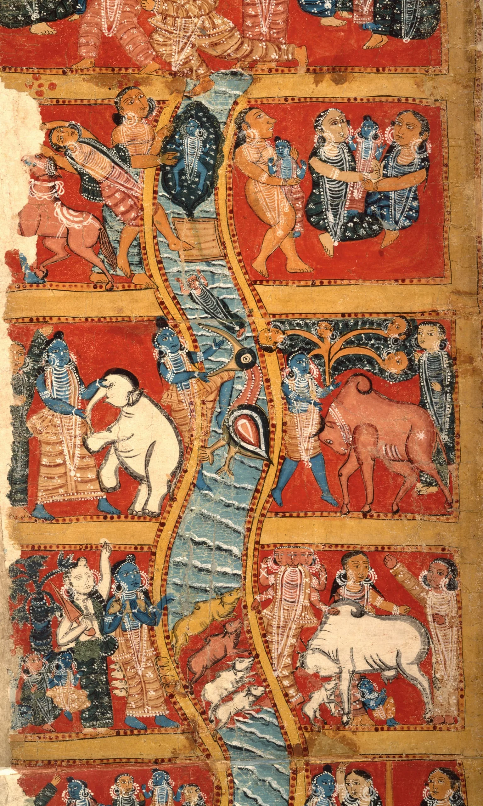 Right: Brahma (?) pays homage to Krishna, the tale of Yashoda and Nanda's cow.