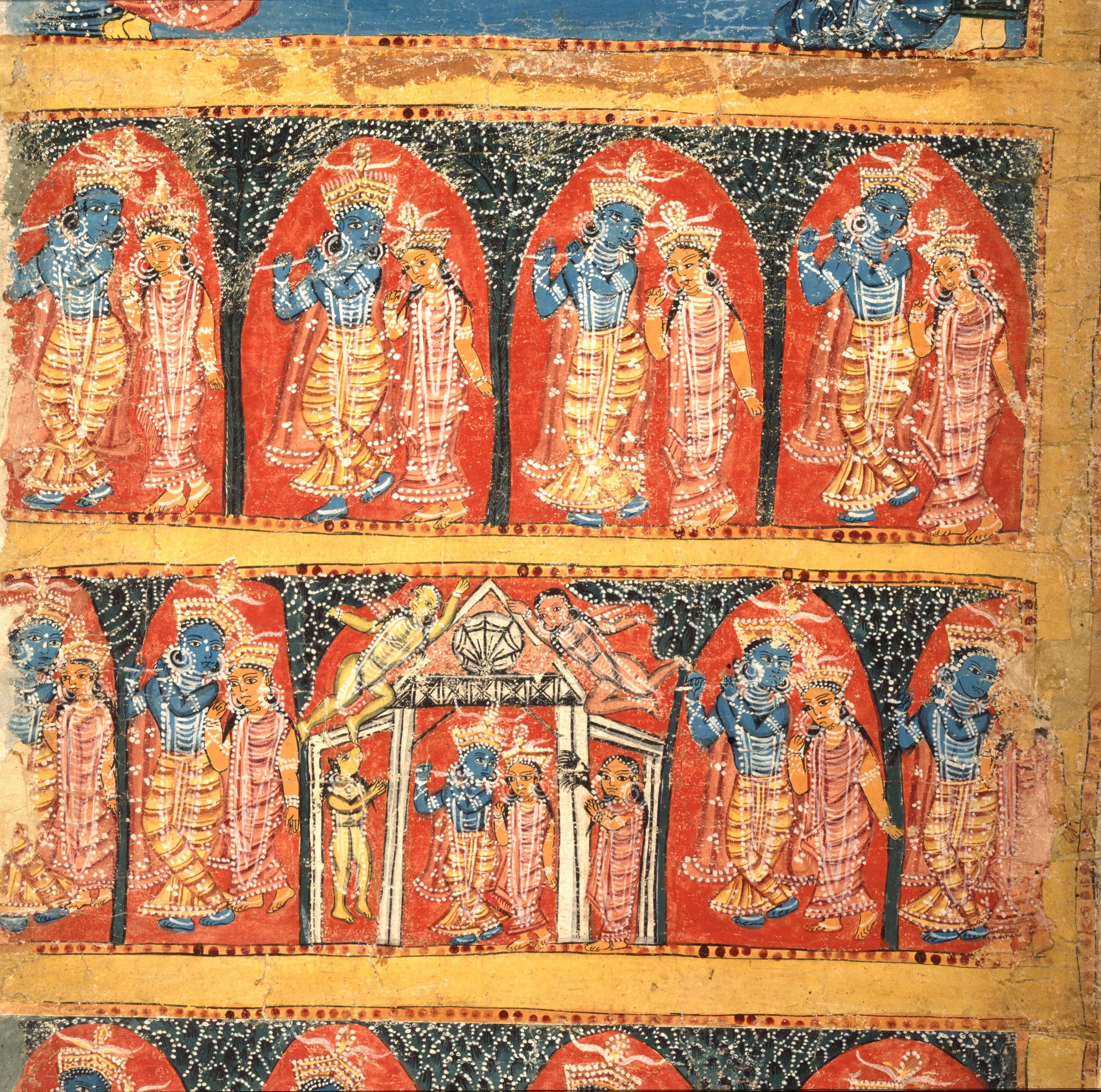 Right: Krishna and Balarama with Yashoda at the butter churn.