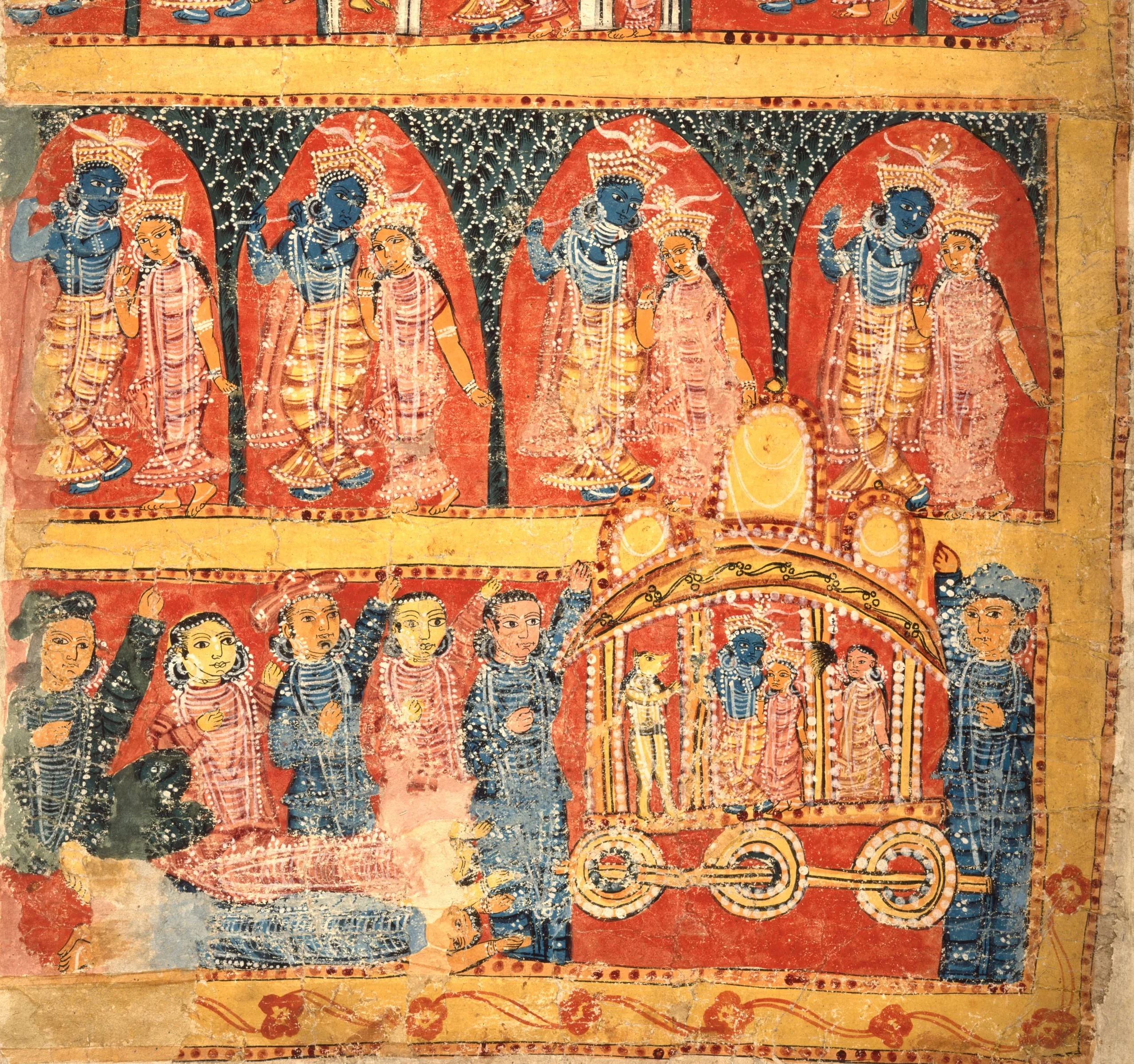 14. Krishna goes to Mathura. The people of Vrindavan bid him farewell and the gopis throw themselves at the wheels of the cart to stop him.