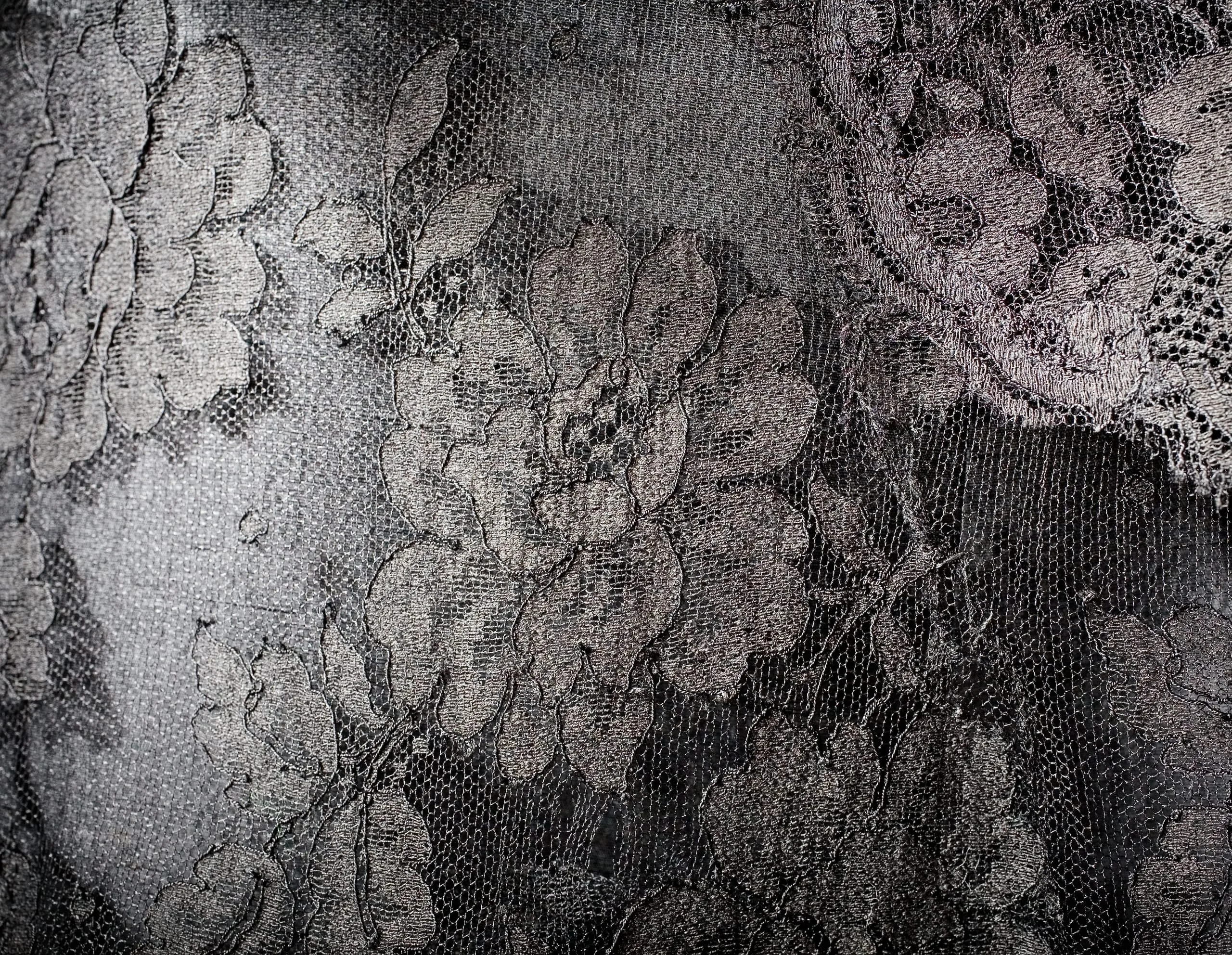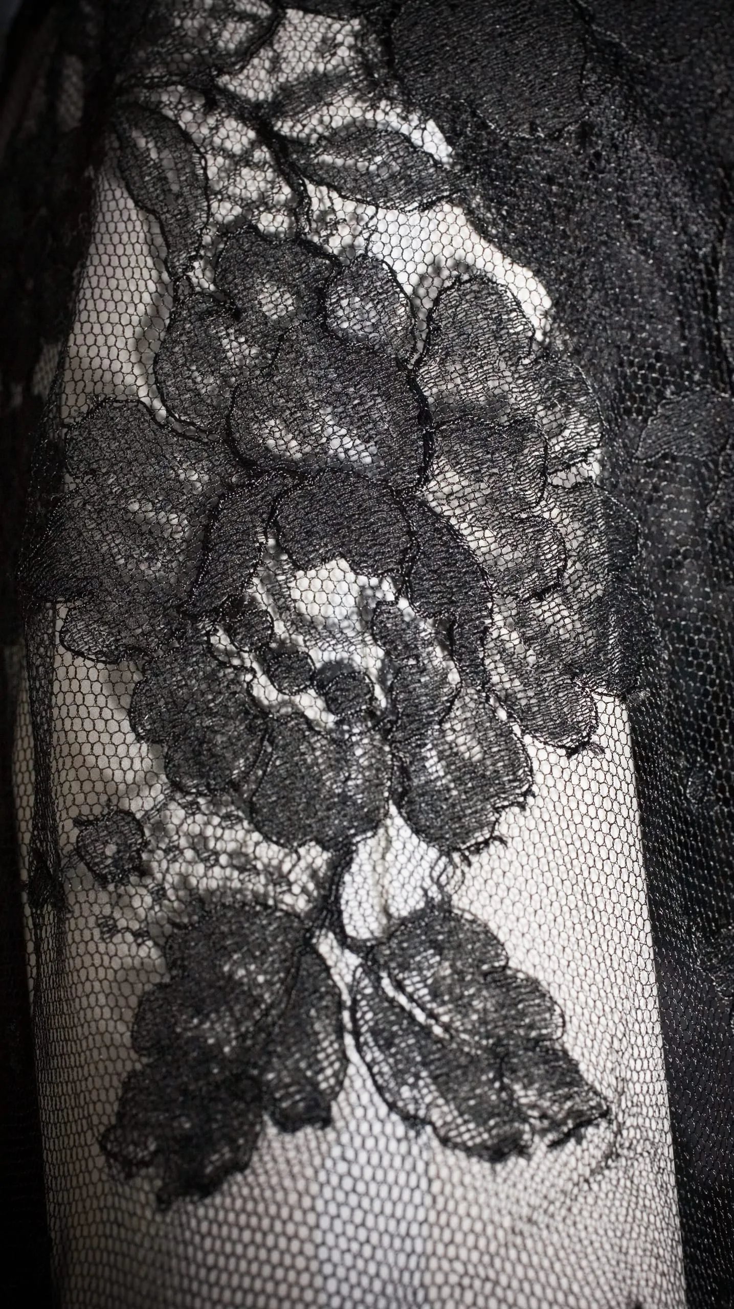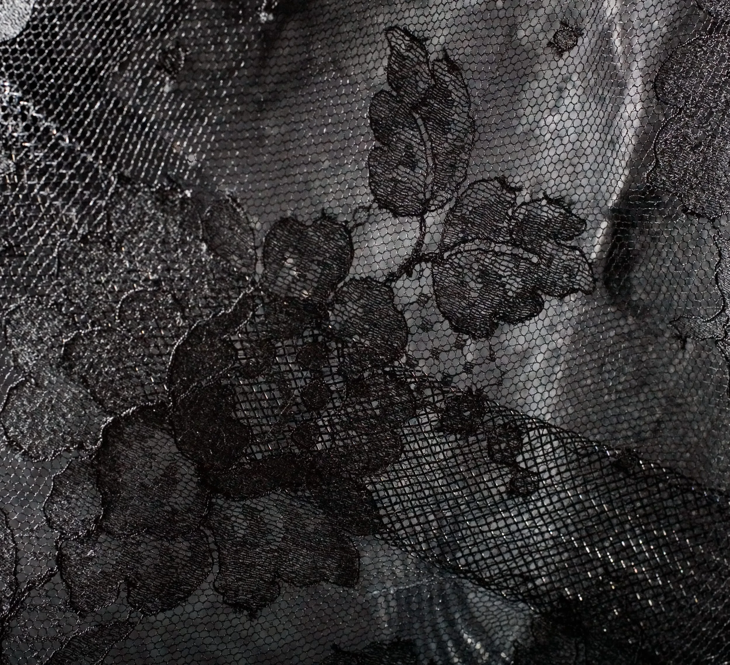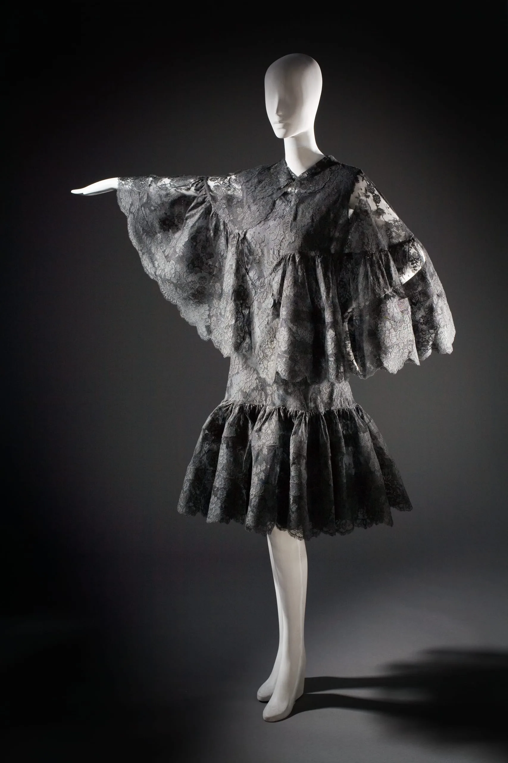 - Dress: silk lace and silk plain weave; Cape: silk lace