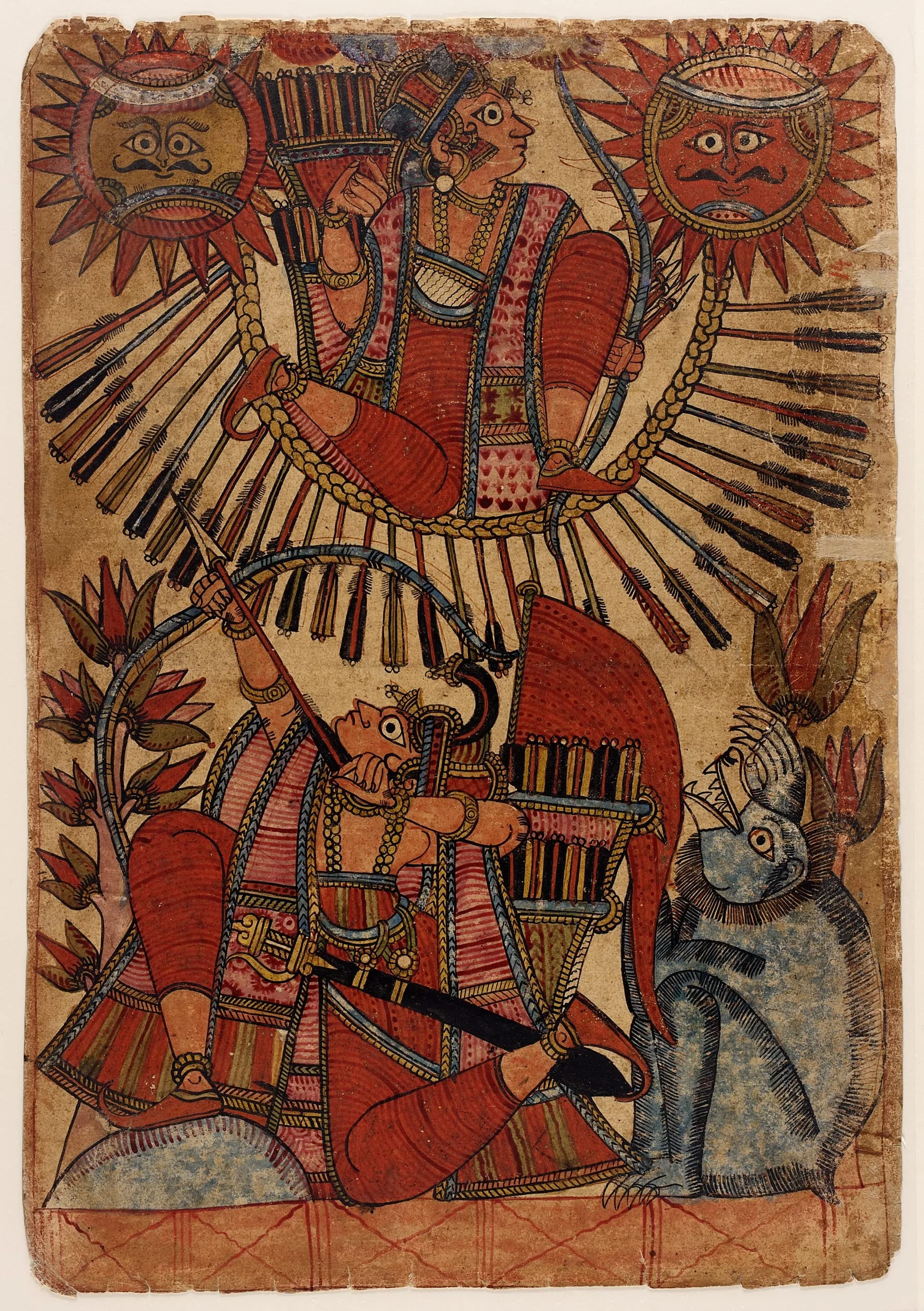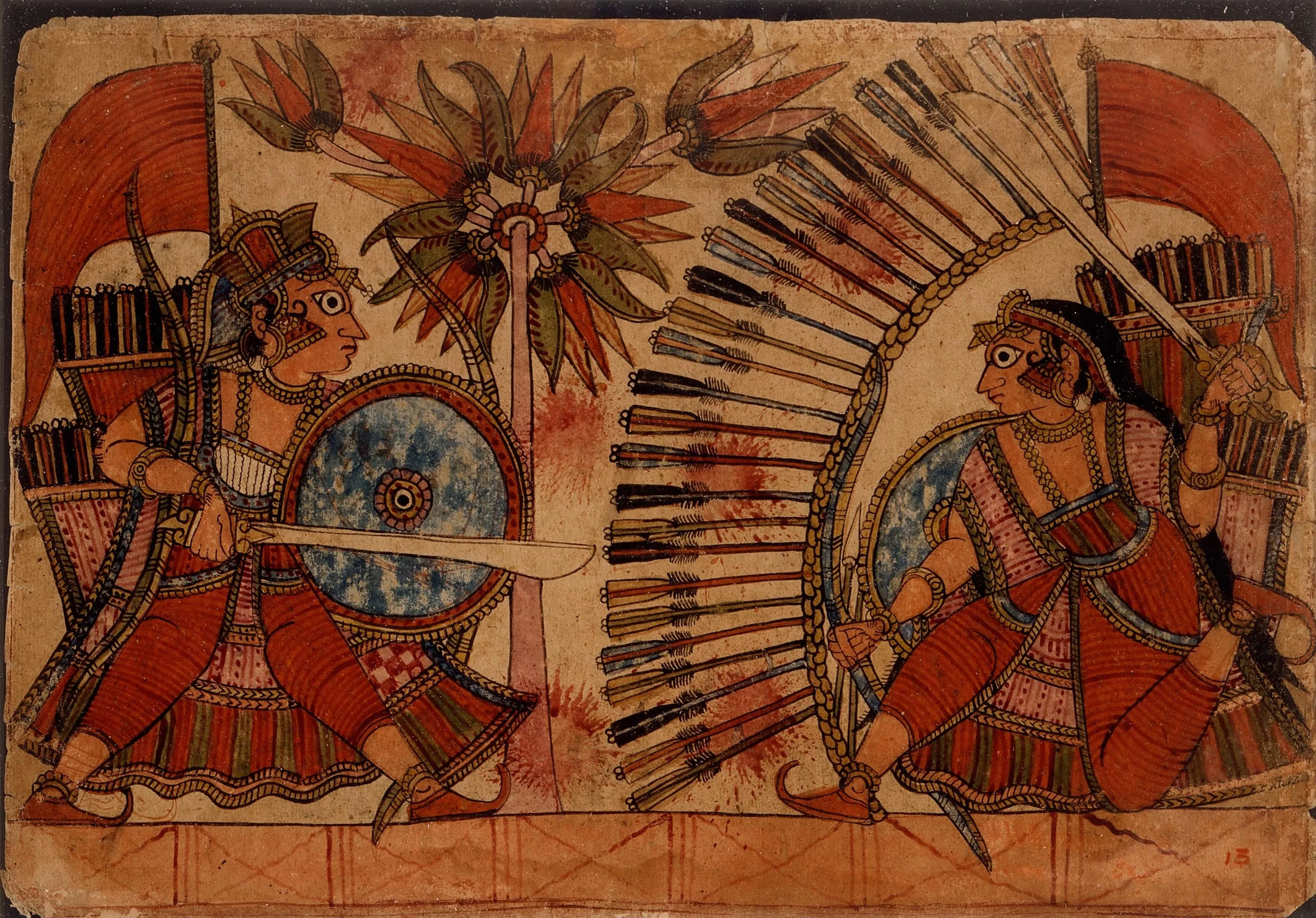 - Vrishaketu Shoots Babhruvahana into the Air on a Circle of Arrows (recto), Babhruvahana Resumes his Fight with Vrishaketu (verso), Scenes from the Story of Babhruvahana, Folio from a Mahabharata ([War of the] Great Bharatas)