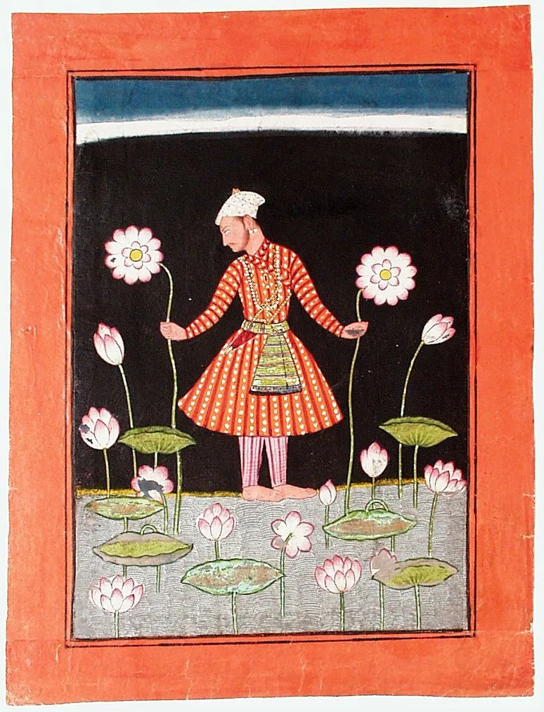 Kamala Ragaputra is the first son of Dipak Raga in the variant ragamala (garland of melodies) classification system known as Meshakarna’s system (developed by Meshakarna, a court priest from Rewa, Madhya Pradesh, in his Ragamala of 1570), which was followed in Pahari ragamalas. Meshakarna’s system has six males (ragas), each of whom who has five or six wives (raginis) and eight or nine sons (ragaputras). The melodies are also compared to a sound in nature or a human activity. Kamala Ragaputra is likened to the sound of a frog. Its imagery typically features a hero with lotuses (kamala). Here, the melody is envisioned as a princely man standing on the edge of a lush lotus pond and holding two lotus blossoms.