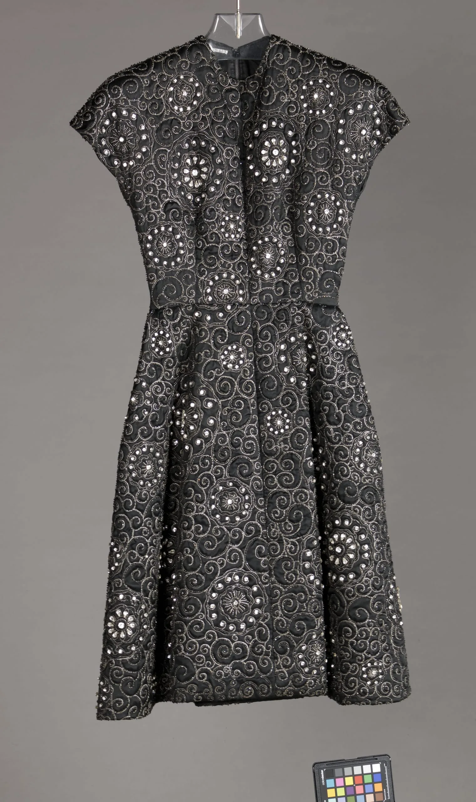 - Silk satin, metallic thread embroidery, glass beads, crystals