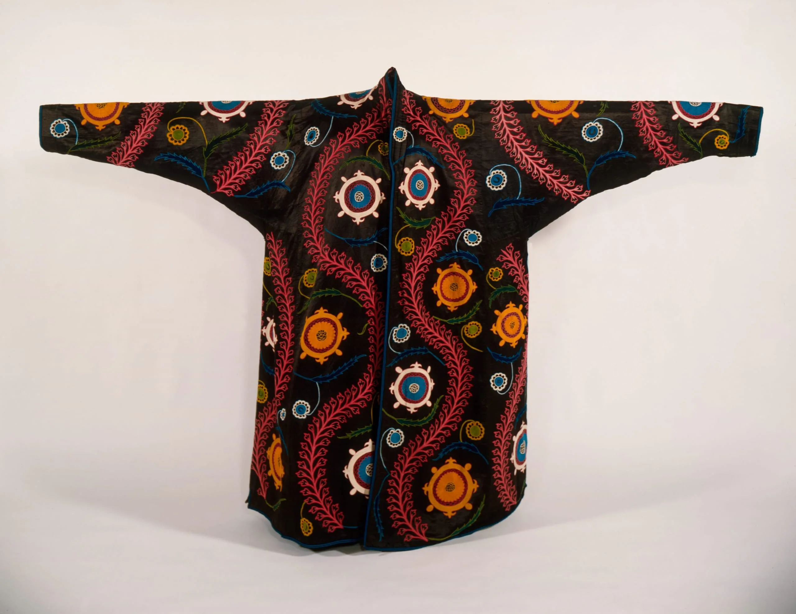 - Silk embroidery in chain and buttonhole stitches on silk and cotton satin weave
