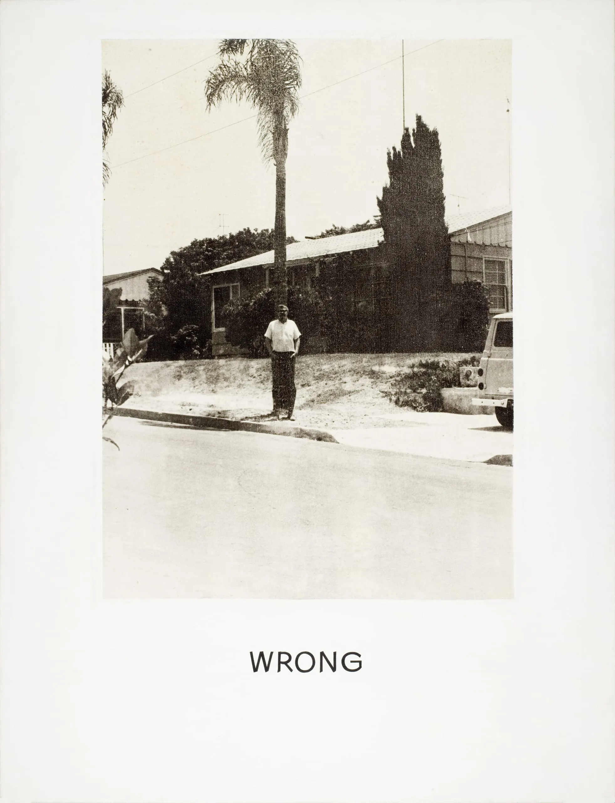 A pioneer of Conceptual art, John Baldessari’s exploration of language questions the very nature of communication, a subject that grows more complex with each technological advance. In Wrong—an early and pivotal example of conceptualism—Baldessari is photographed with a palm tree seemingly growing out of his head, exemplifying a well-known error in photographic composition. The title is meant to refer to multiple types of “wrongness” and also may be ironic: a basic tenet of avant-garde art is that there are no inviolable rules or universal standards when it comes to making, conceiving, or judging art. As Baldessari explained, “I love the idea that somebody would just say that this is right and this is wrong. So I decided I would have. . . a work of art that was wrong— which seems right to me.”