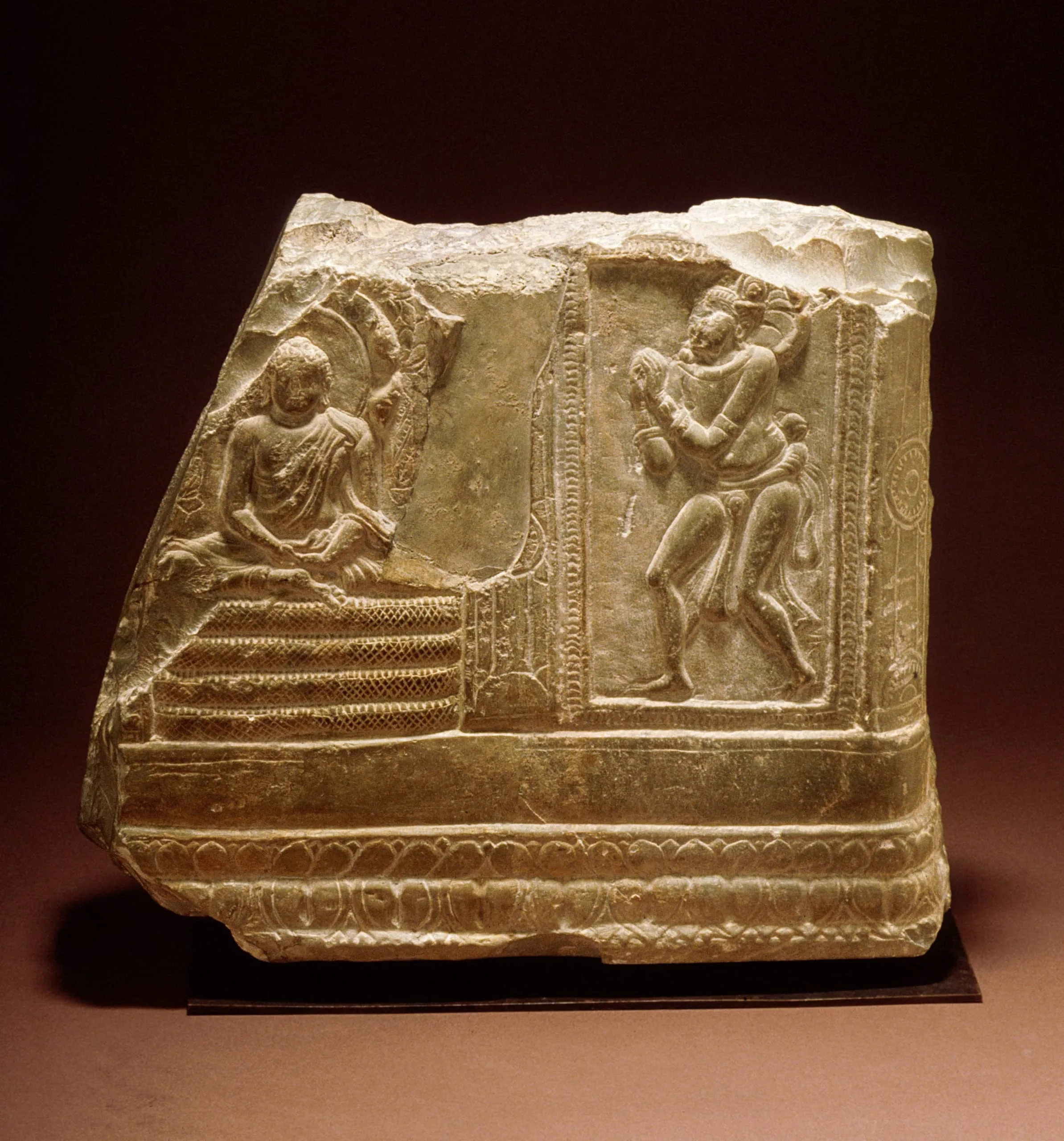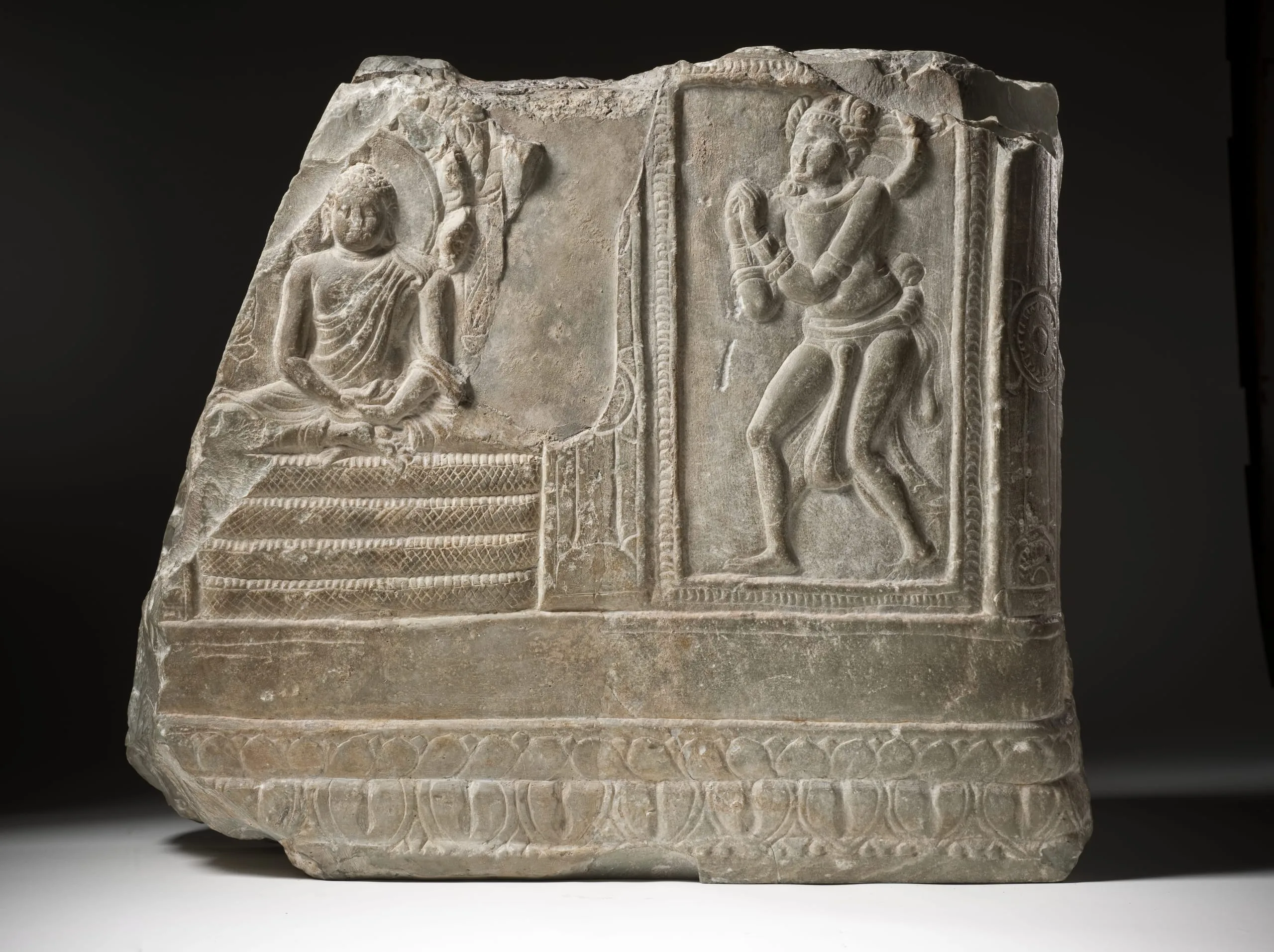 This image represents the occasion when the Buddha, after his enlightenment at Bodhgaya, sat meditating beneath a tree. A fierce storm arose that threatened to interrupt the Buddha’s serenity, and the serpent-king Muchalinda spread his hood over the Buddha for seven days to protect him. Here, the Buddha is shown enthroned upon the coils of the snake’s body, while the polycephalic hood forms a canopy. In the panel on the right, the personified serpent-king approaches the Buddha with his hands held in the gesture of adoration (anjali mudra). He is identified by his cobra-hood nimbus with a snake emanating from his left shoulder.