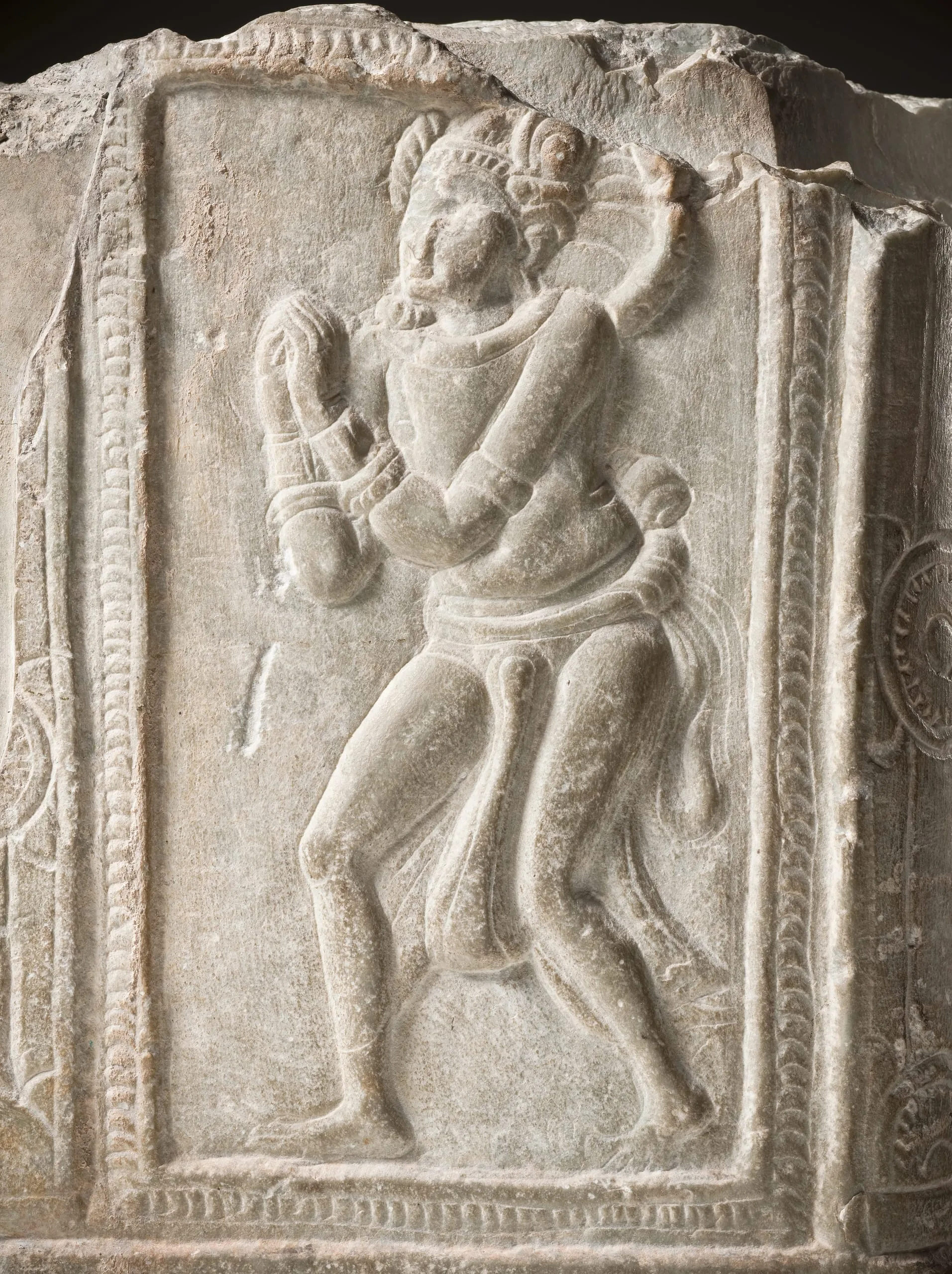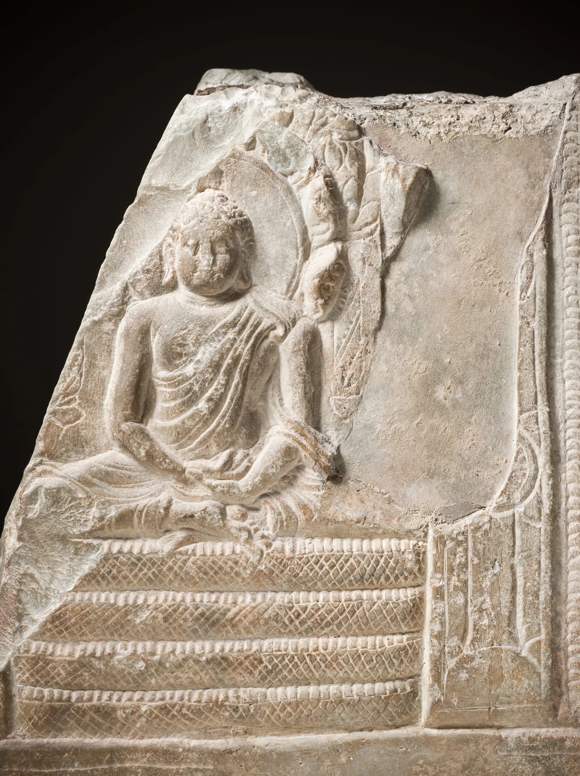 At Goli village and the principal sites of Nagajunakonda and Amaravati there were Buddhist monastic communities that commissioned large stupas (funerary and reliquary monuments) adorned with exquisitely carved reliefs. This sculpture can be identified as being from the Goli village stupa because of the distinctive treatment of the Buddha’s robe wherein the drapery is arranged so as to produce an extra flap over the left shoulder which appears almost like an epaulet. The treatment of the Buddha’s robes in early Andhra sculptures also suggests Western stylistic influence through contact with the nearby Roman trading ports.