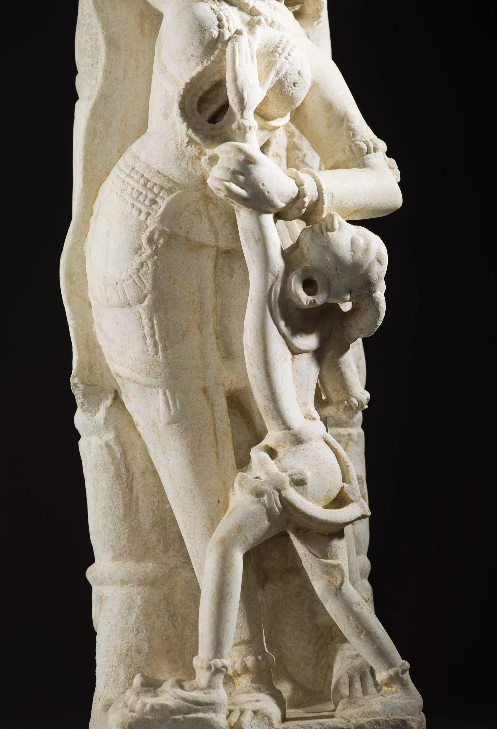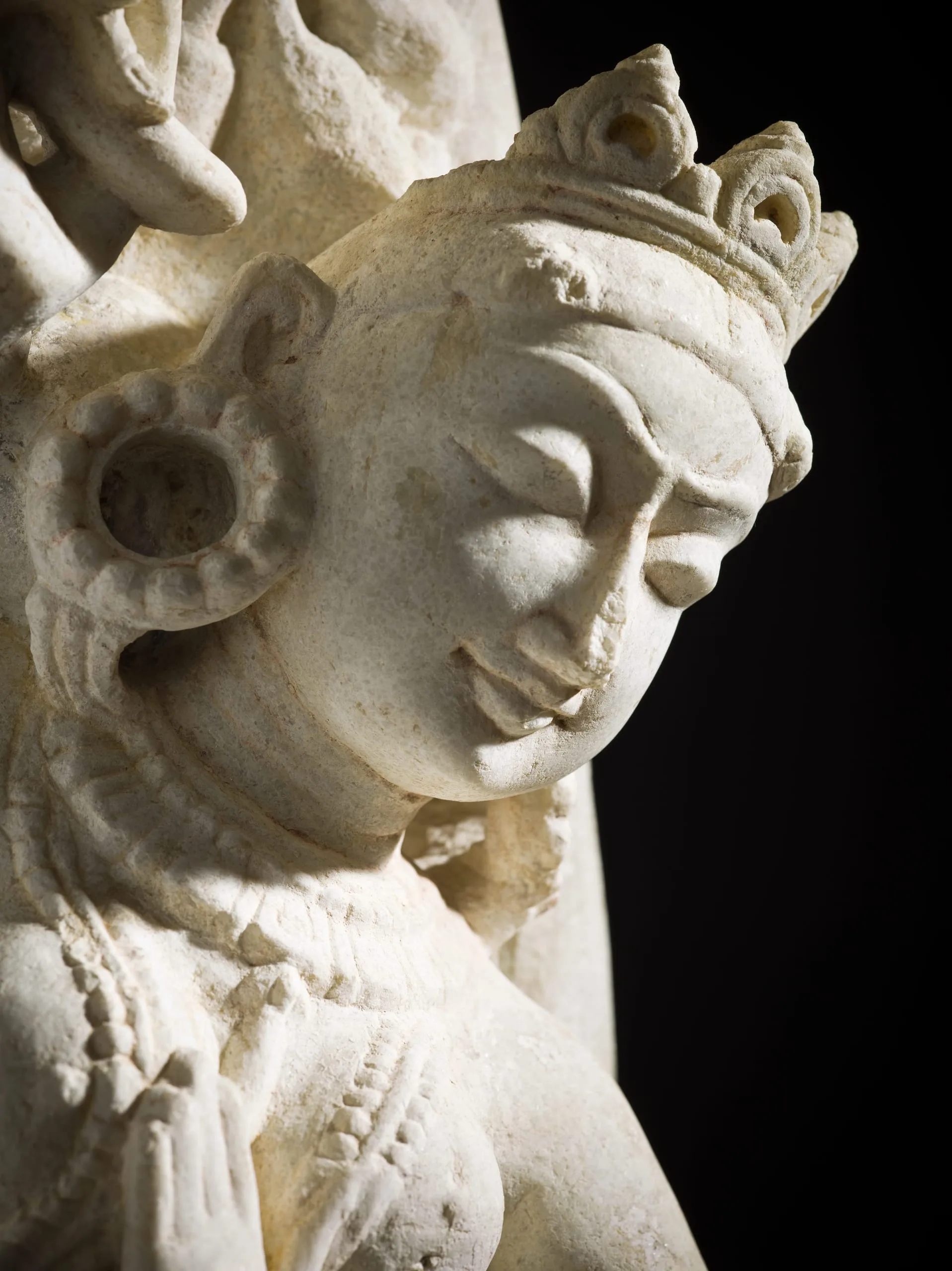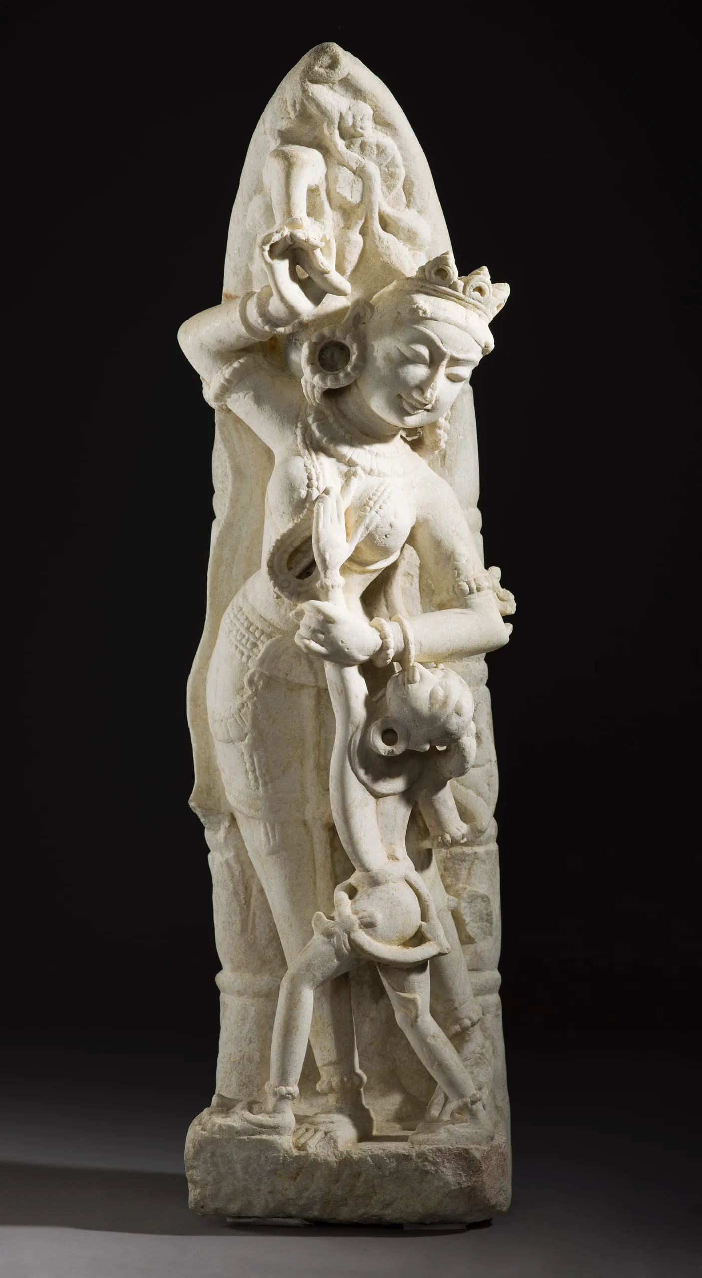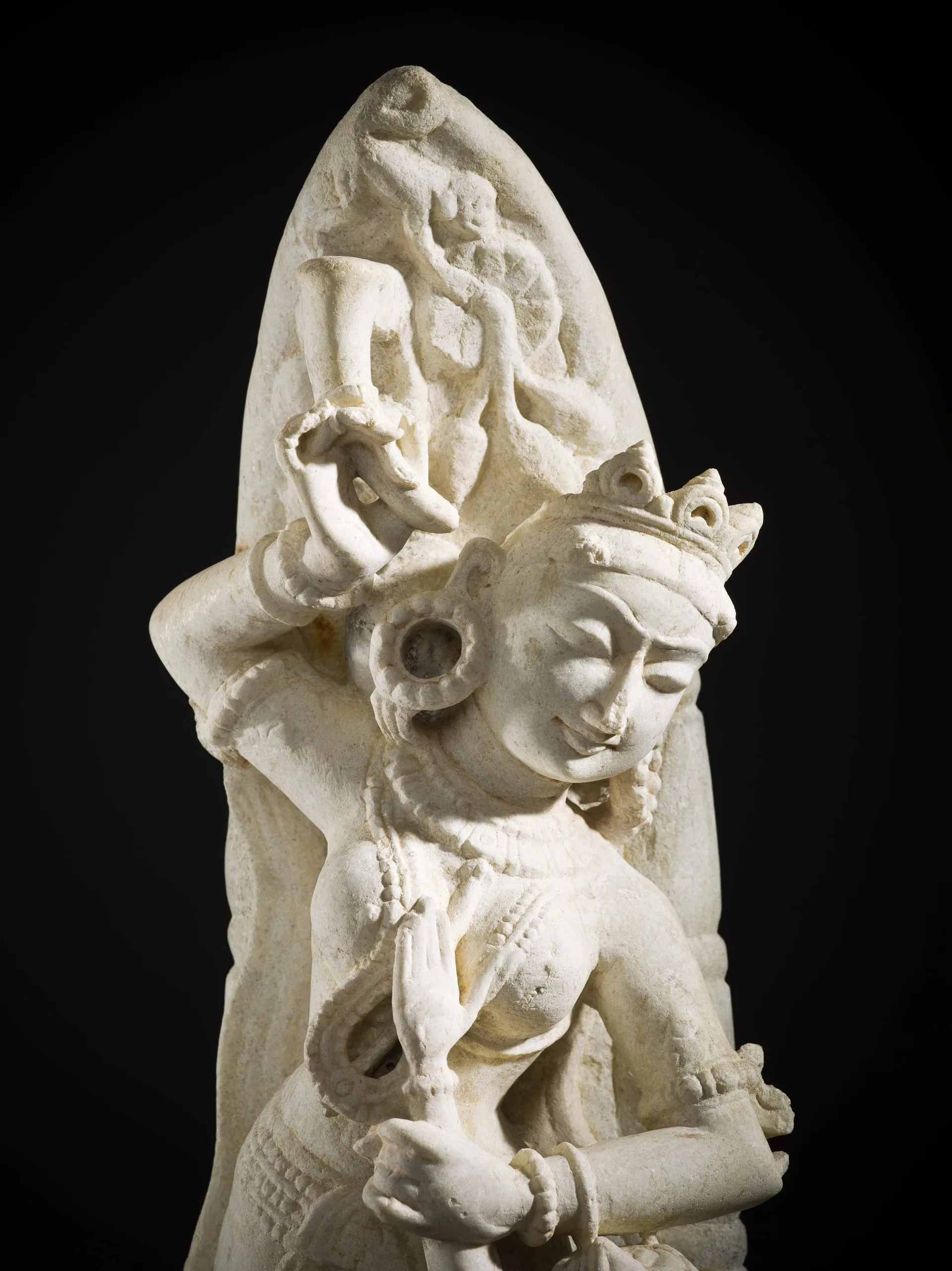 This marble sculpture of a celestial nymph (apsaras) originally served as an architectural bracket figure adorning the interior dome of a Jain temple, most likely in Rajasthan. Situated far above eye level, such works were often not as polished as the important devotional images placed closer to the ground. Nevertheless, they contributed significantly to the overwhelming visual exuberance of the temple's interior.