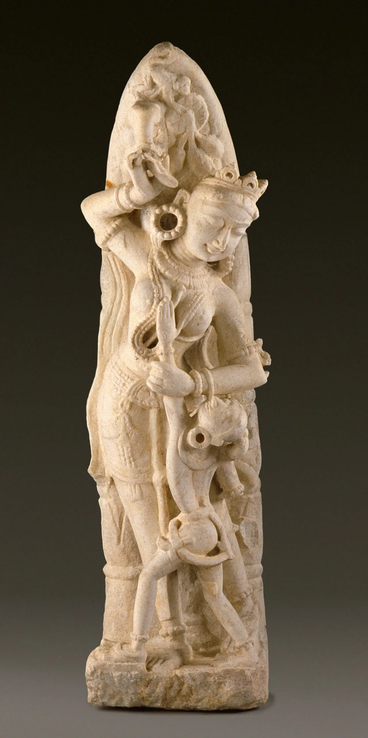 The crowned and bejeweled nymph is backed by a pointed strut carved in the shape of a lotus petal. She teases a boy by holding a drinking horn or cornucopia symbolic of abundance out of the reach of his upraised hand beside her breast. An ancillary vignette at the top of the strut showing a monkey reaching for a mango is perhaps intended as a pun on the main scene. Celestial nymphs such as this are often portrayed in a more playful mode than images of deities, which are bound by canonical restrictions. See also M.80.62.