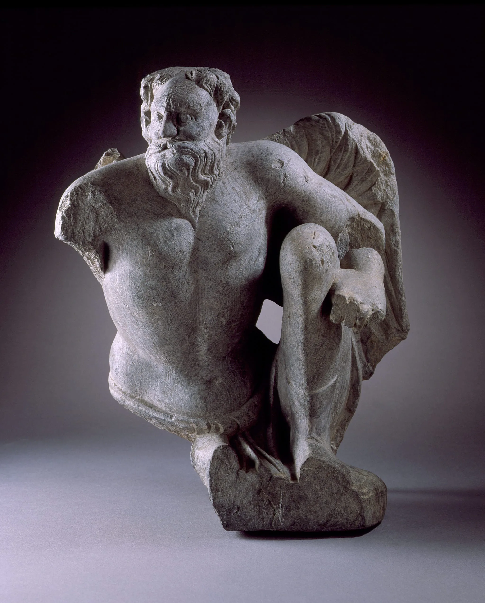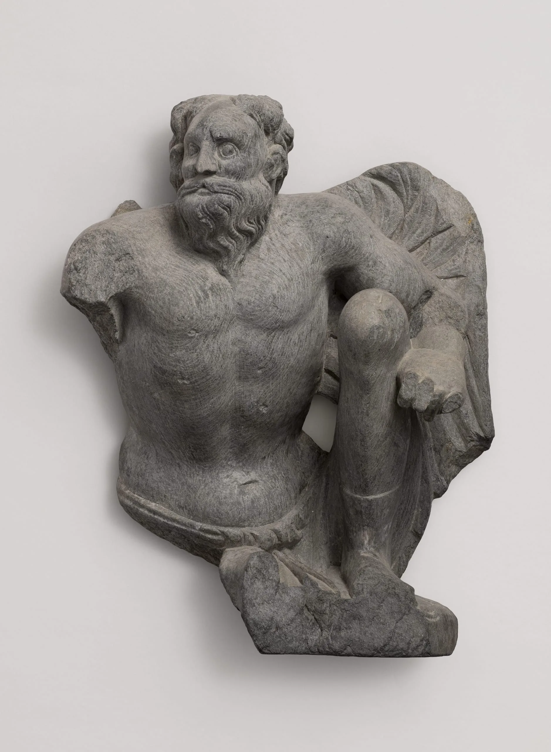 This winged Atlas and myriad analogous representations in stone and stucco originally served as atlantes figures encircling the bases of Buddhist stupas (funerary monuments) in ancient Gandhara (an important nexus of the Silk Routes and the transmission of Buddhism in present-day northwestern Pakistan and northeastern Afghanistan). Conceptually based on Classical Western atlantid architectural support figures, but portrayed as a winged version of the muscular Greek titan Atlas who supported the celestial spheres on his shoulders for eternity, Gandharan Atlas figures were fashioned seated with varying leg and arm positions. Here, Atlas sits with his left knee and leg upright and his now-missing right knee and leg probably originally lying flat on the ground. His left arm extends horizontally so that the overturned hand is adjacent to the knee. His now-lost right arm may have originally been extended straight or slightly crooked with the right hand resting on or beside the knee. Some renditions have one or two arms upraised in a supporting pose. Atlas figures can have exposed genitalia or be covered by lower garments or sashes. The mustachioed and bearded head is generally slightly cocked to one side, as here, or is sometimes staring straight ahead if the body is in a symmetrical frontal posture.