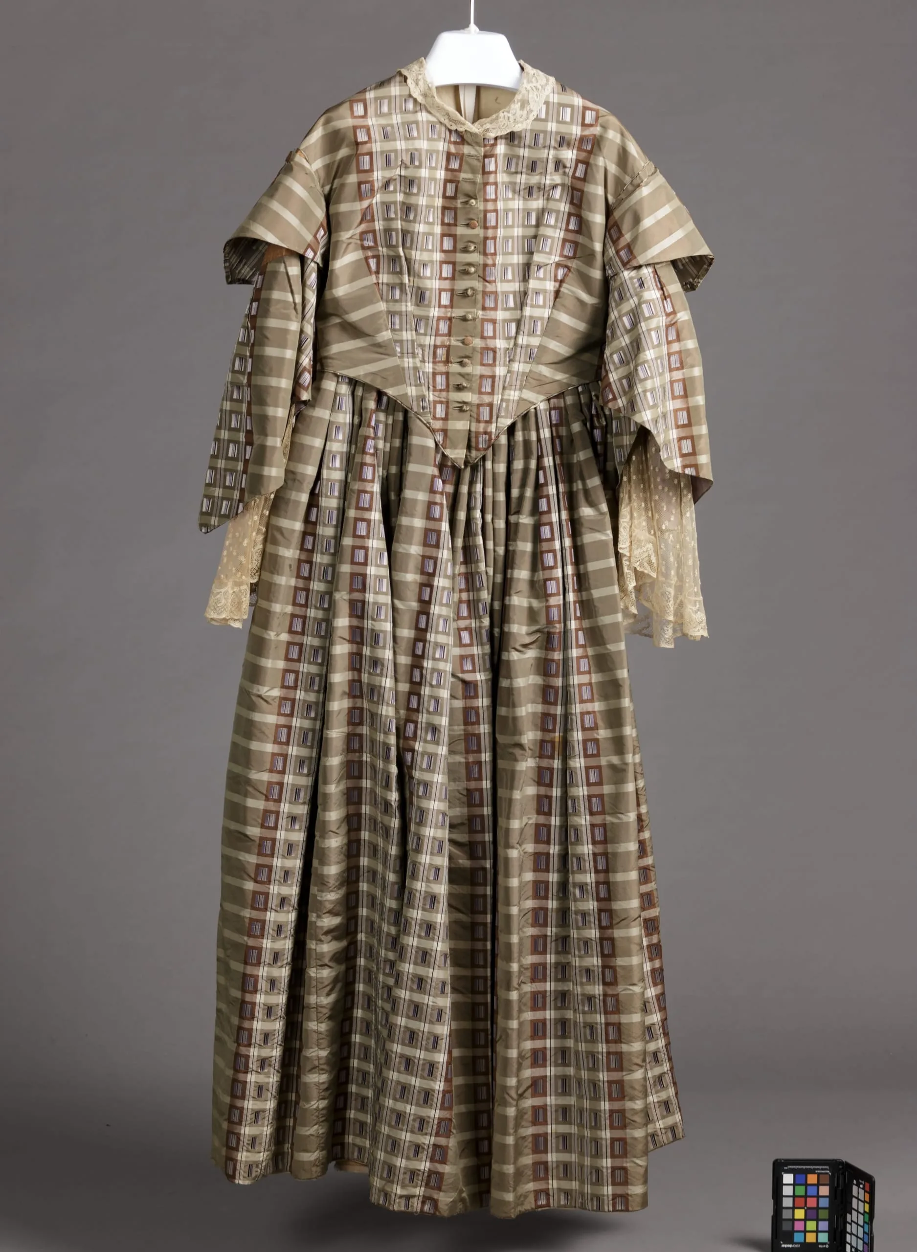 - a)Silk plain weave (taffeta) with silk supplementary warp patterning with cotton lace trim