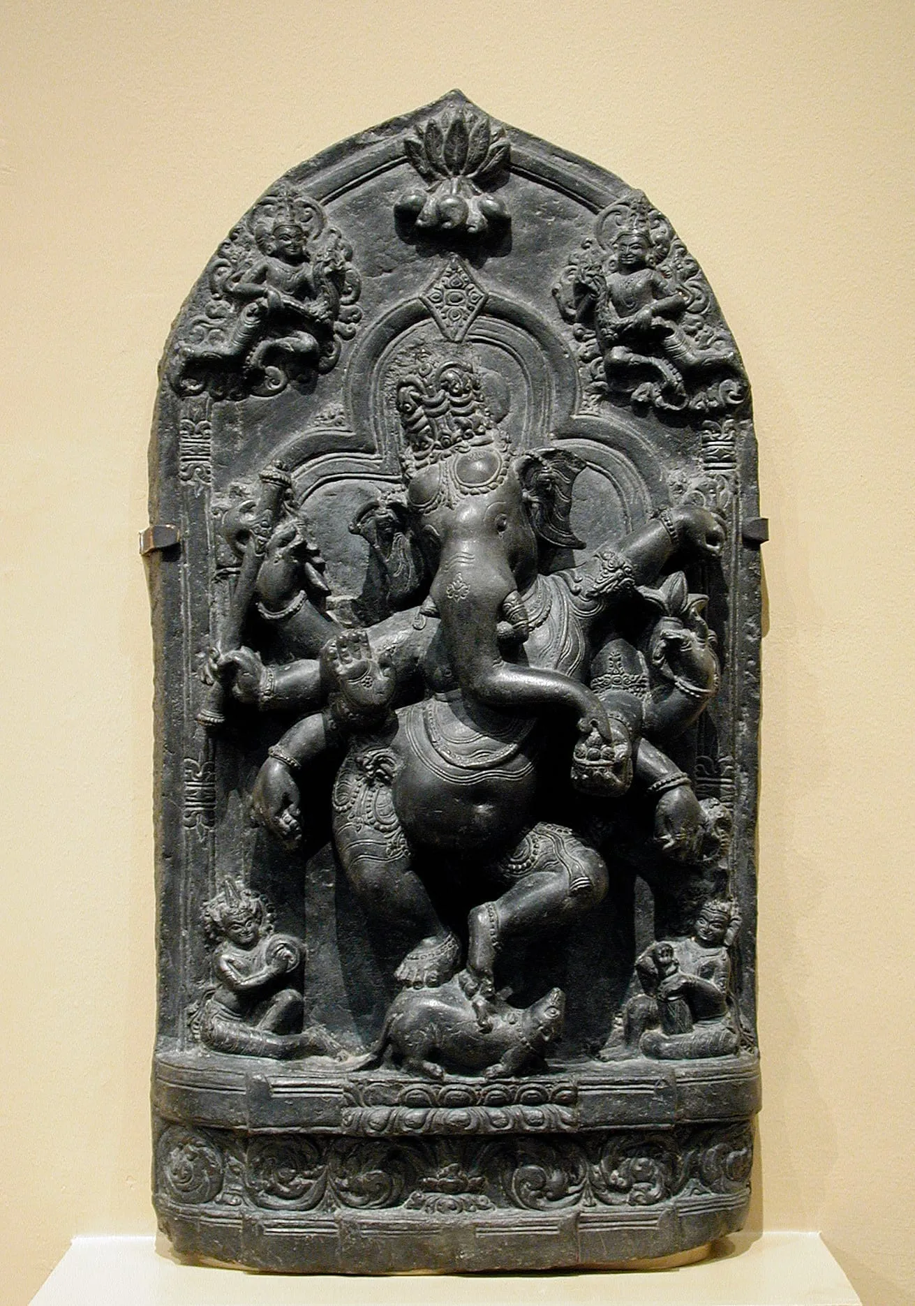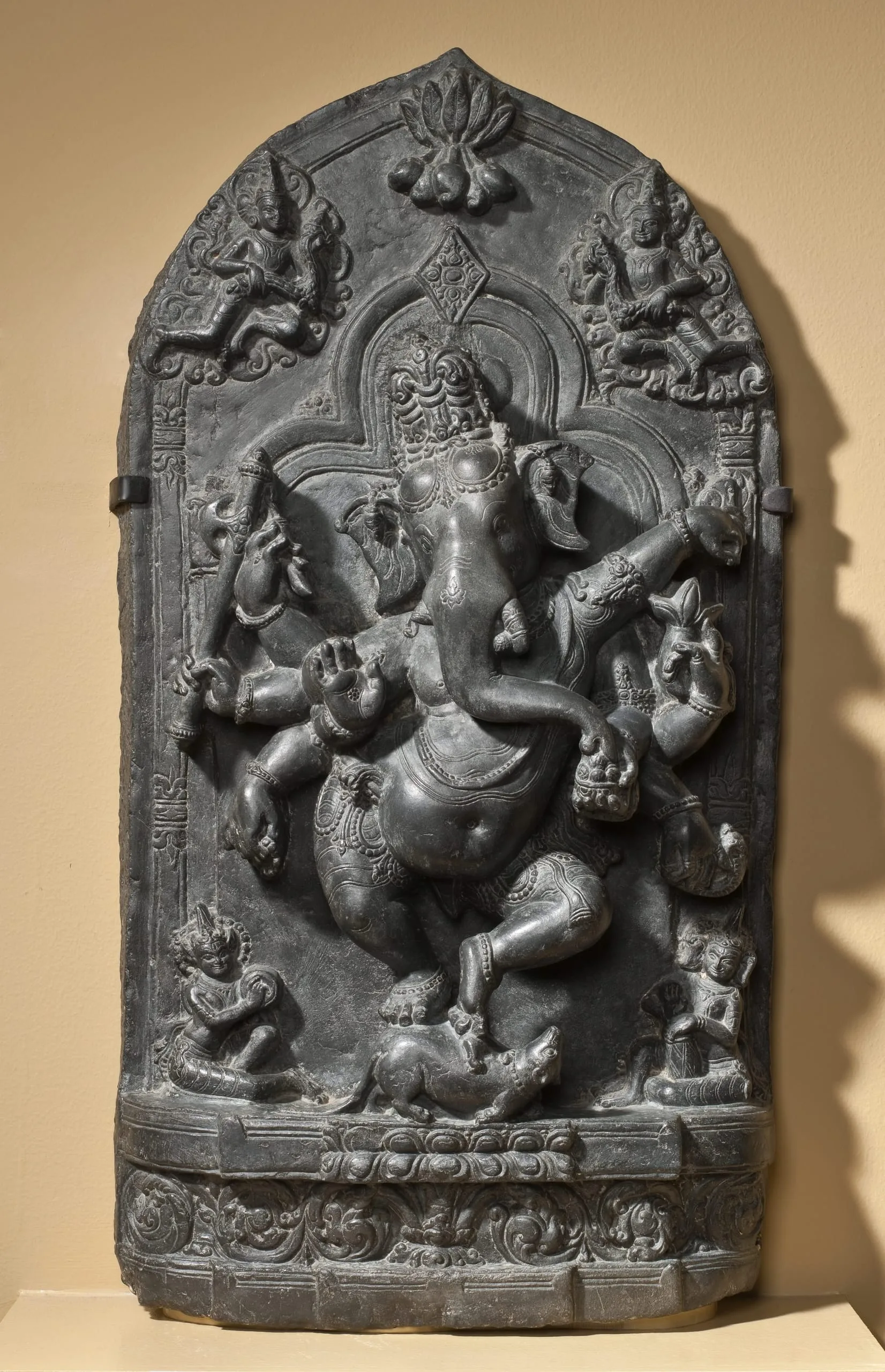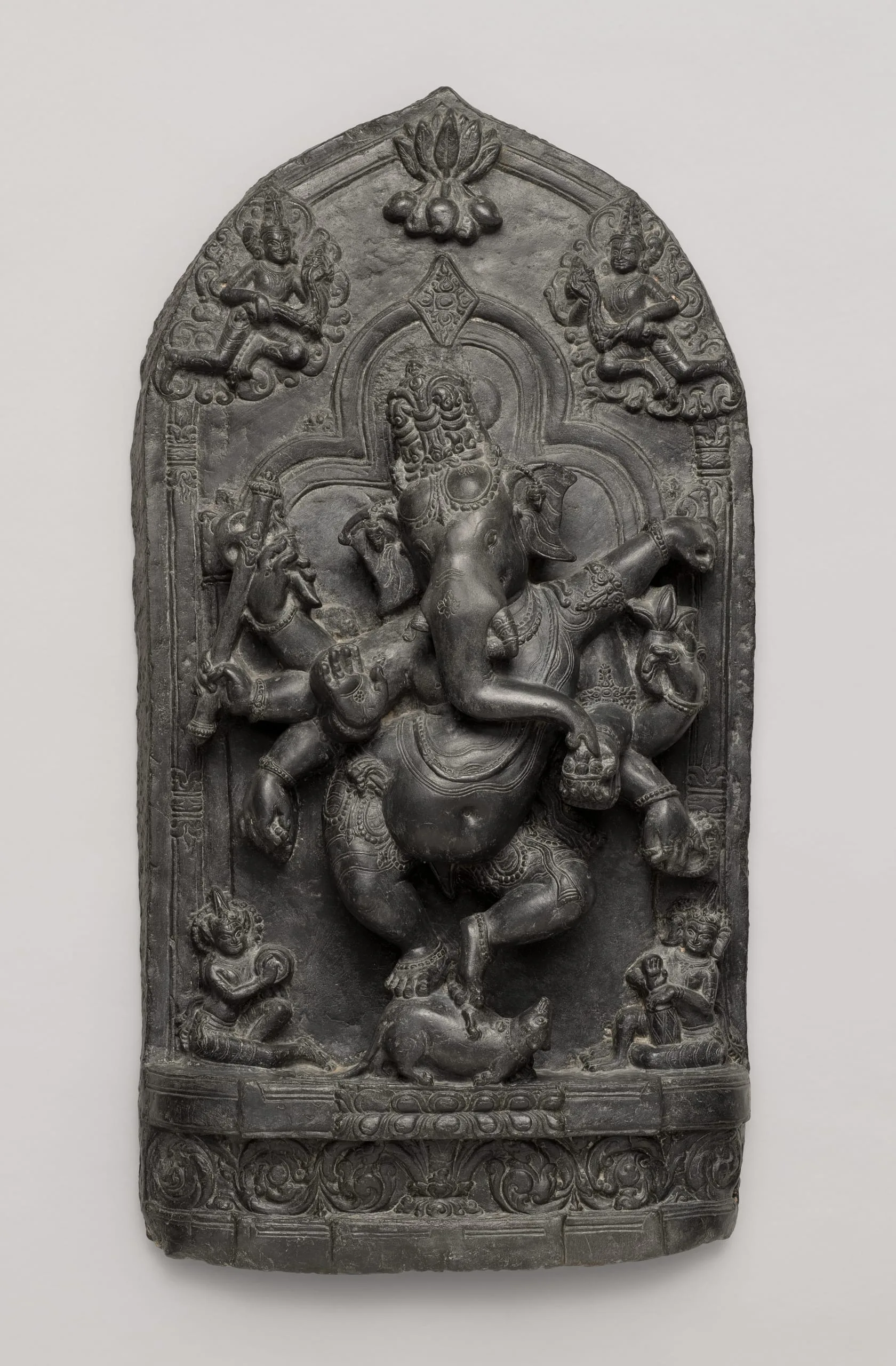 In this eight-armed representation of Ganesha, the Lord of Obstacles, he dances exuberantly on the back of his mount, identified as either a rat (akhu) or mouse (musaka), which are both renowned for their ability to break through obstacles. Ganesha’s principal right hand is held in the ‘fear-not’ gesture (abhaya mudra). In his remaining right hands (top to bottom), he holds his broken tusk, battle axe, and rosary. His principal left hand and arm are raised in the ‘elephant hand pose’ (gaja hasta). In his remaining left hands (top to bottom), he holds a radish, bowl of sweetmeats from which he is eating with his trunk, and a serpent. A double trefoil areola emanates around Ganesha’s head. At the apex of the relief is a pendant bunch of mangoes, symbolic of fertility and auspiciousness. Two celestial garland bearers (maladharas) fly above Ganesha in his honor. Seated on the base are two celestial musicians (gandharvas): on his left, a drummer with elephant ears emblematic of his association with Ganesha; and on his right, a cymbalist with rodent ears evocative of his rat mount.