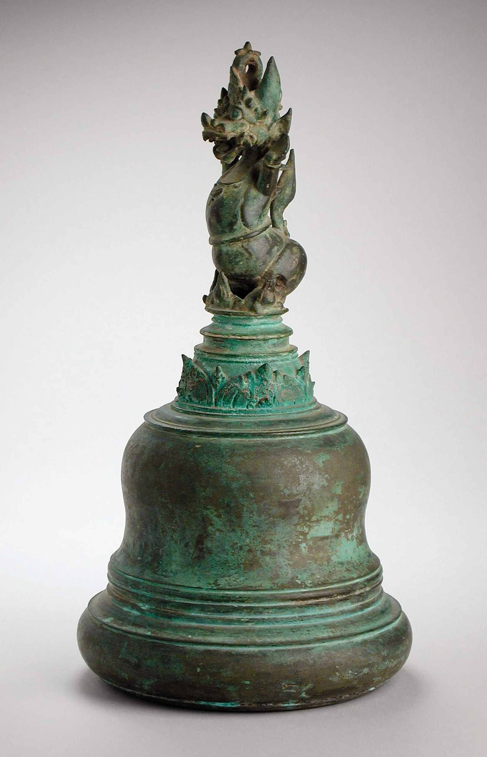 Hanging bells were often hung in Indonesian temple courtyards or monasteries. The top of the bell was frequently in the form of a rearing lion, with bulls, serpents, and various symbols less utilized. Hanging bells do not have clappers to produce their sound. Rather, the bell was rung by beating the lower rim of its circular base, called a sound bow, with a stick wrapped at one end with cloth. See J. E. van Lohuizen-de Leeuw, Indo-Javanese Metalwork (Stuttgart: Linden-Museum, 1984), pp. 84-87, nos. 50-53; Pauline Lunsingh Scheurleer and Marijke J. Klokke, Divine Bronze: Ancient Indonesian Bronzes from A.D. 600 to 1600 (Leiden: E. J. Brill, 1988), pp. 124-125, nos. 72-73; and Jan Fontein, The Sculpture of Indonesia (Washington: National Gallery of Art, 1990), p. 240, no. 73.