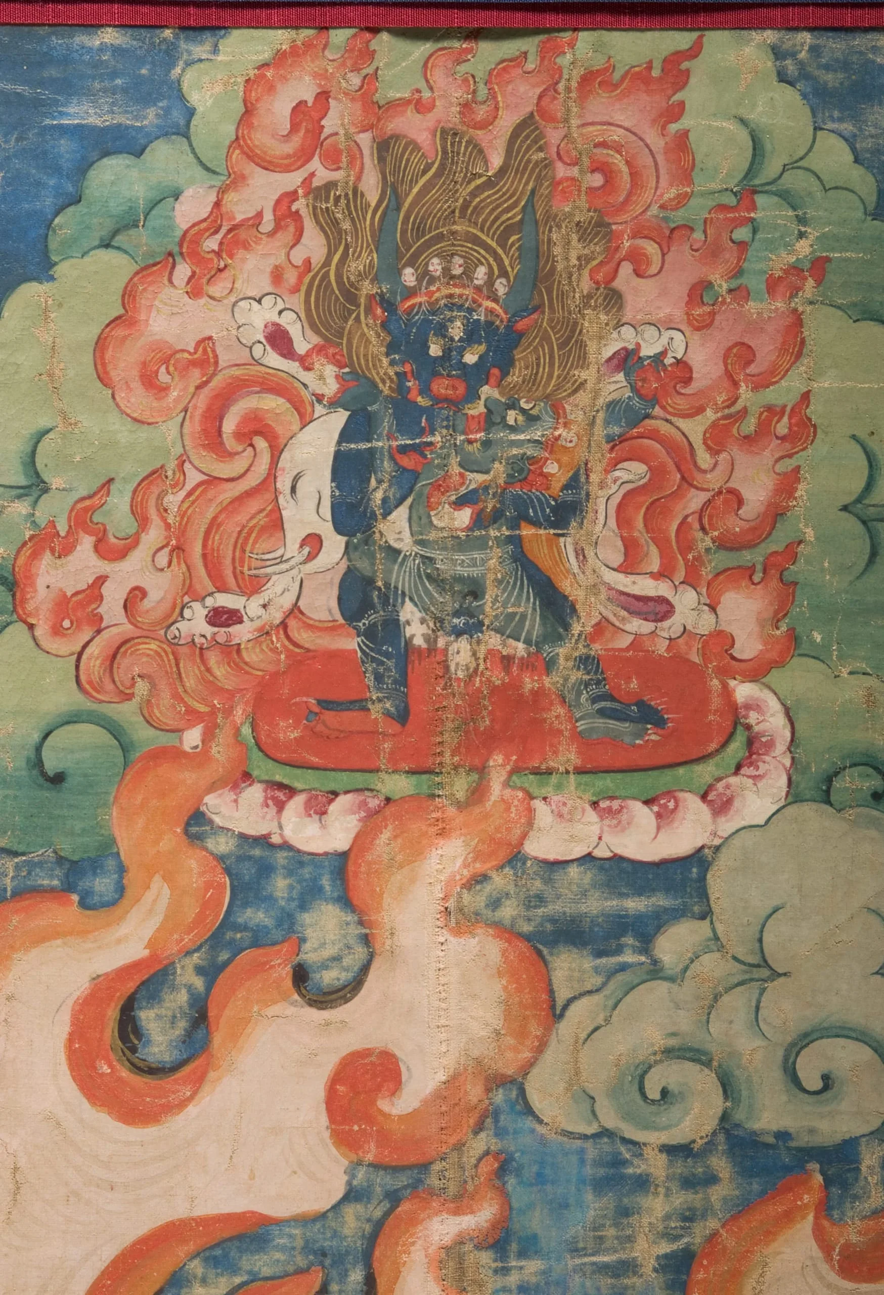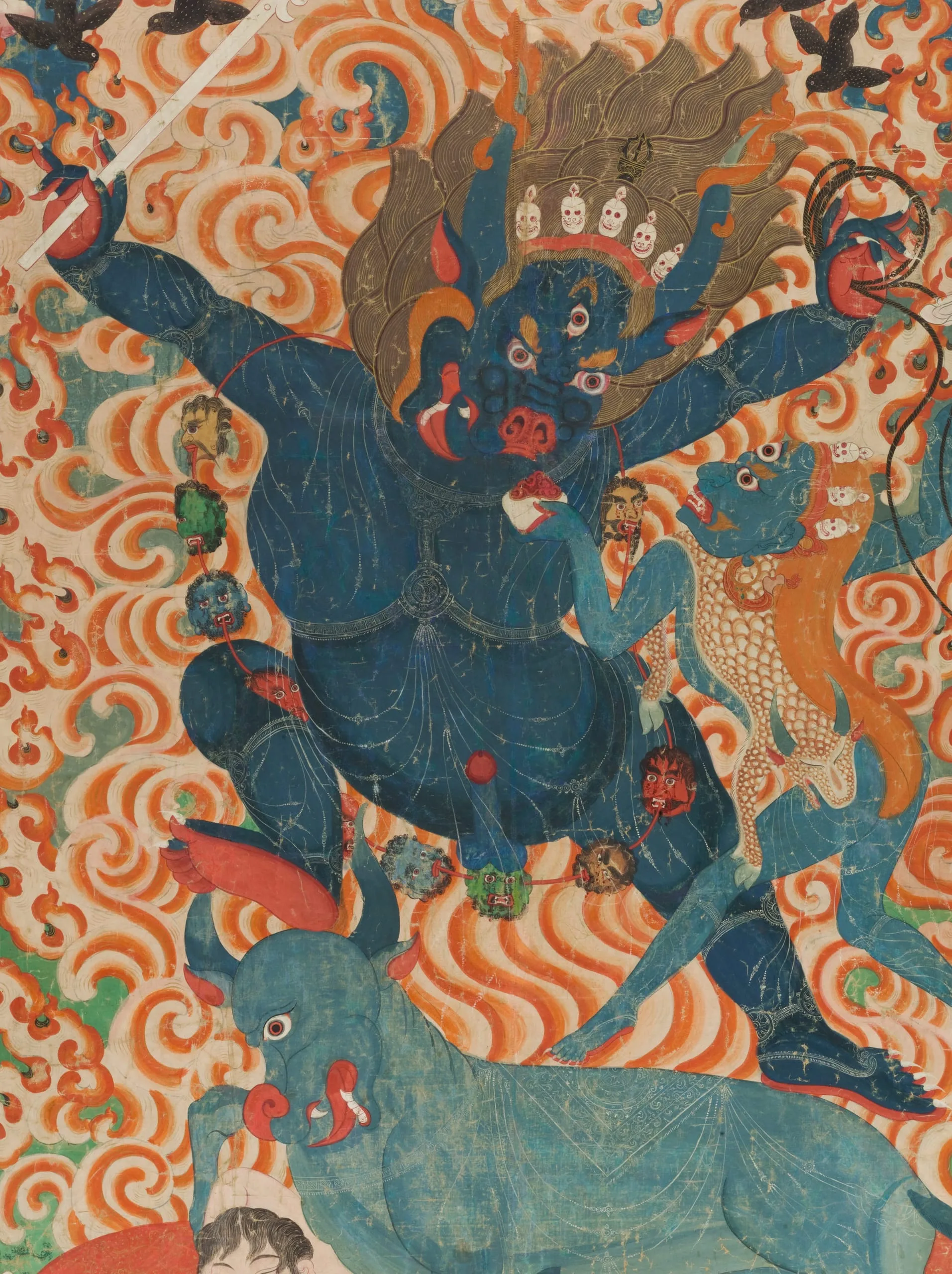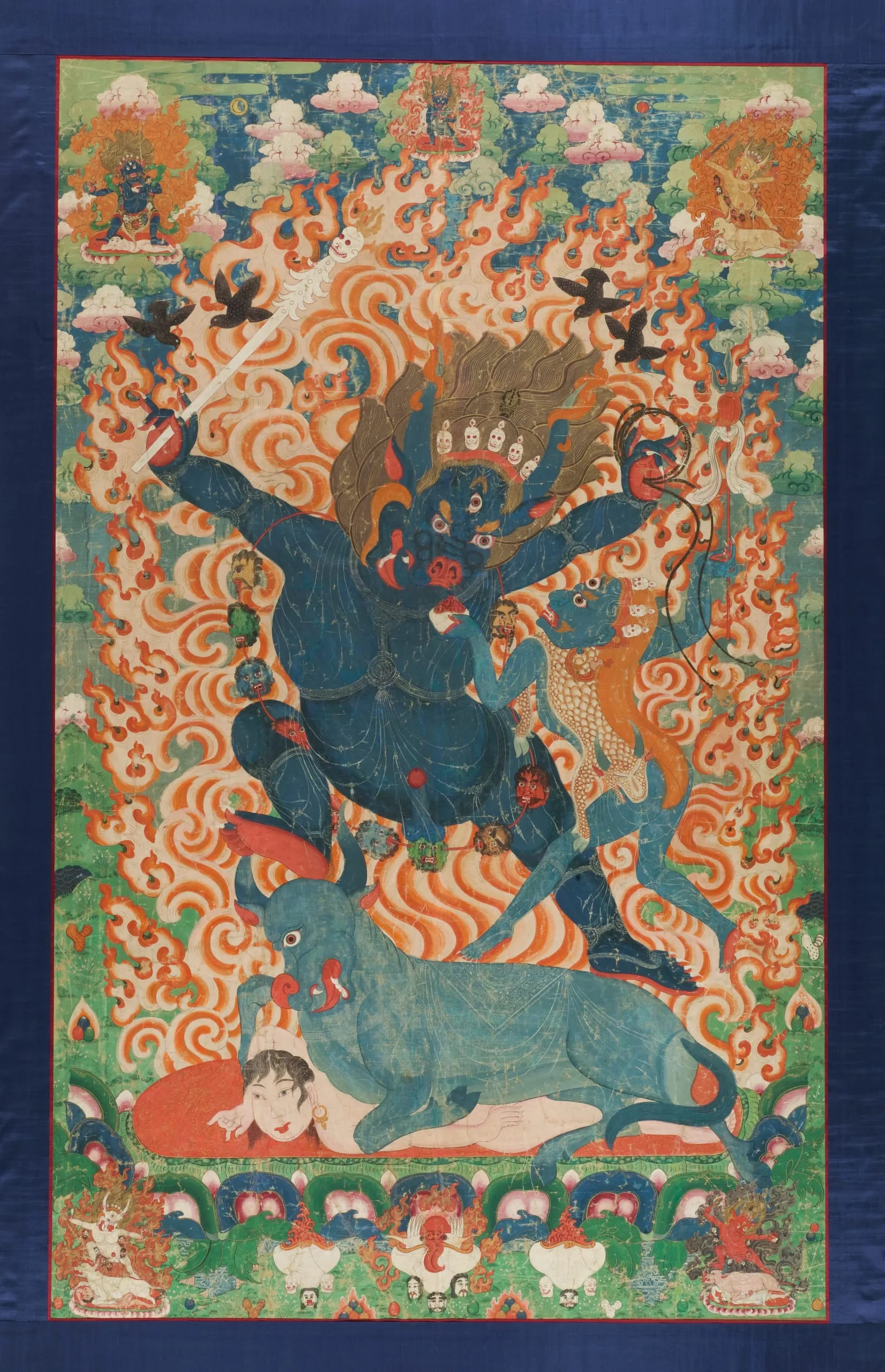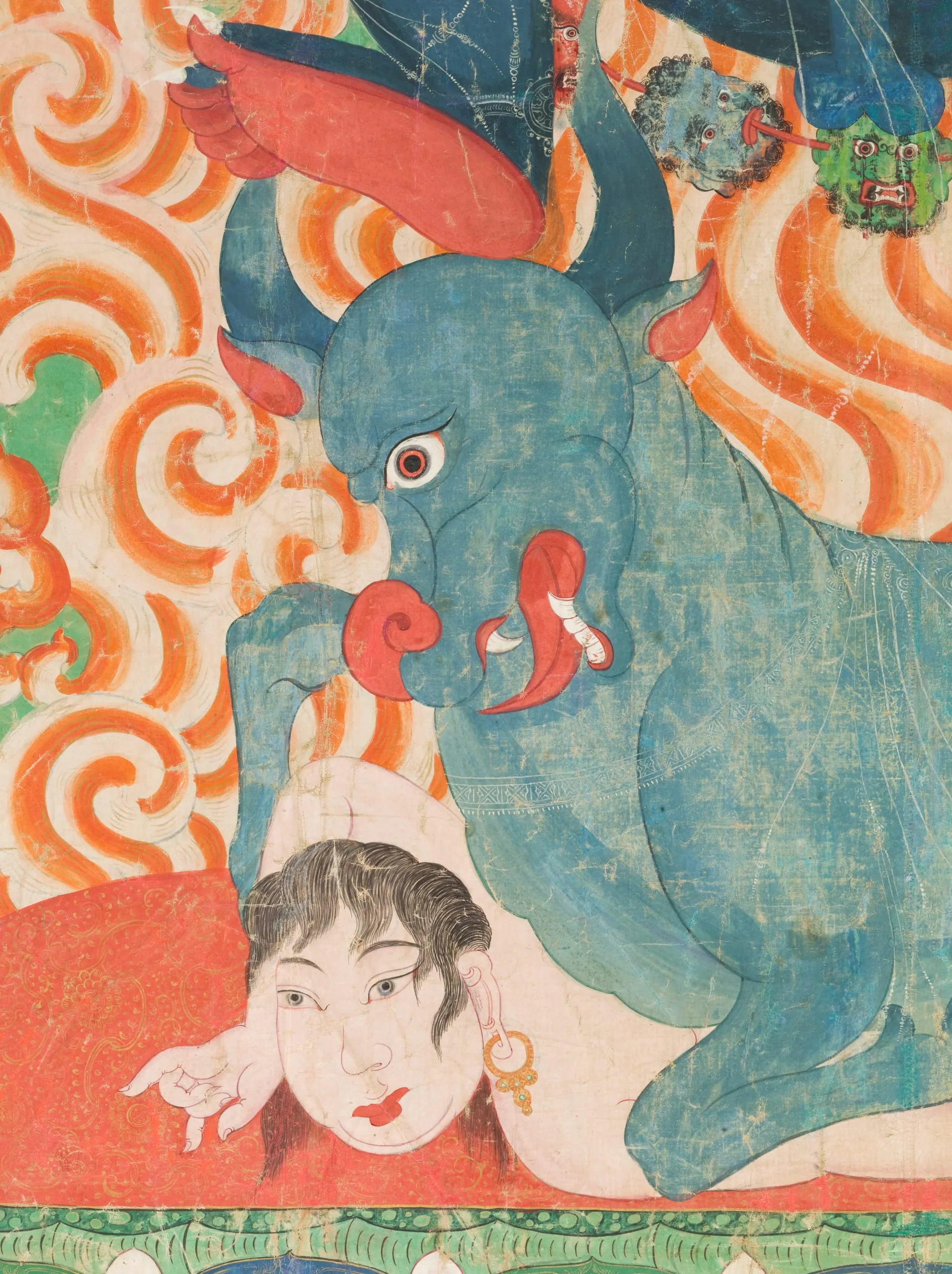 At 94 ½ inches in height, this is one of the largest Tibetan ceremonial paintings (thangka) outside of Tibet. It depicts the Vajrayana (esoteric) Buddhist protective deities Yama and his sister Yami. Yama is the Lord of the Underworld who judges the soul at the gates of hell. As a Dharmaraja (King of the [Buddhist] Law), Yama is a major member of the Dharmapalas (Protectors of the [Buddhist] Law), who are believed to defend Buddhism and its teachings, and destroy the hindrances of its followers. He is specifically depicted here in his conceptual form of the Outer Yamaraja (Lord of Death), who protects Buddhists and monasteries from droughts, bandits, and other evils. See also M.84.104.